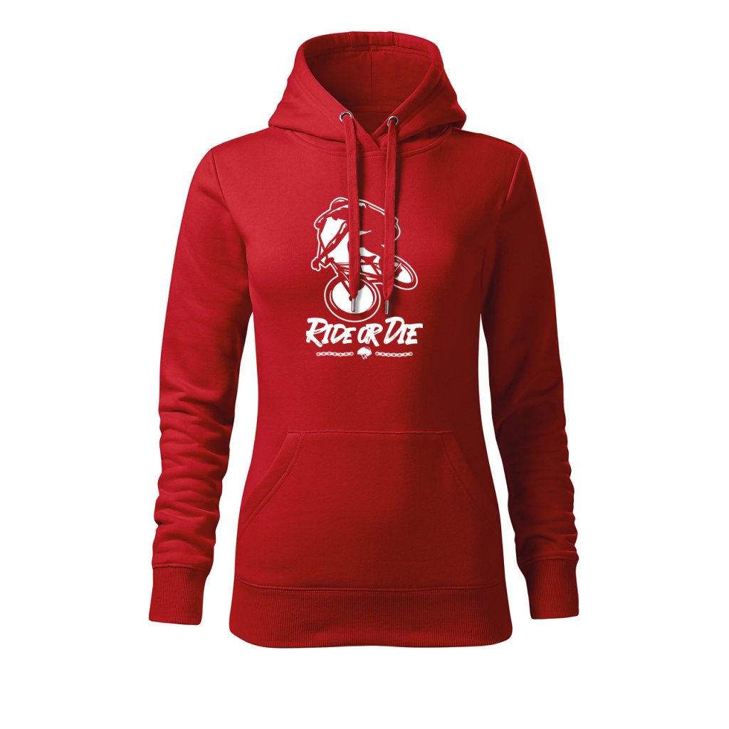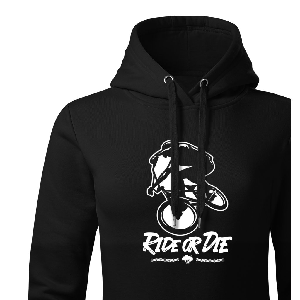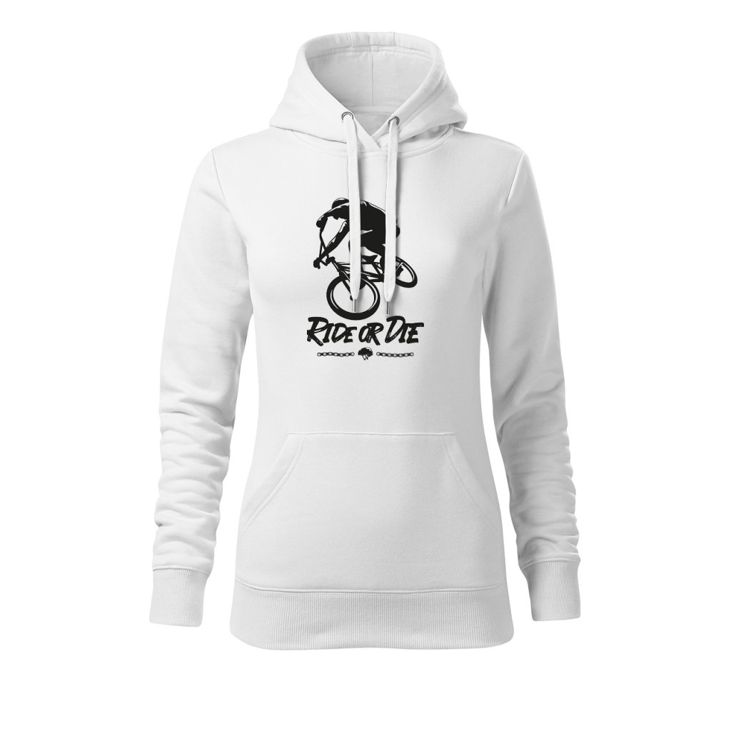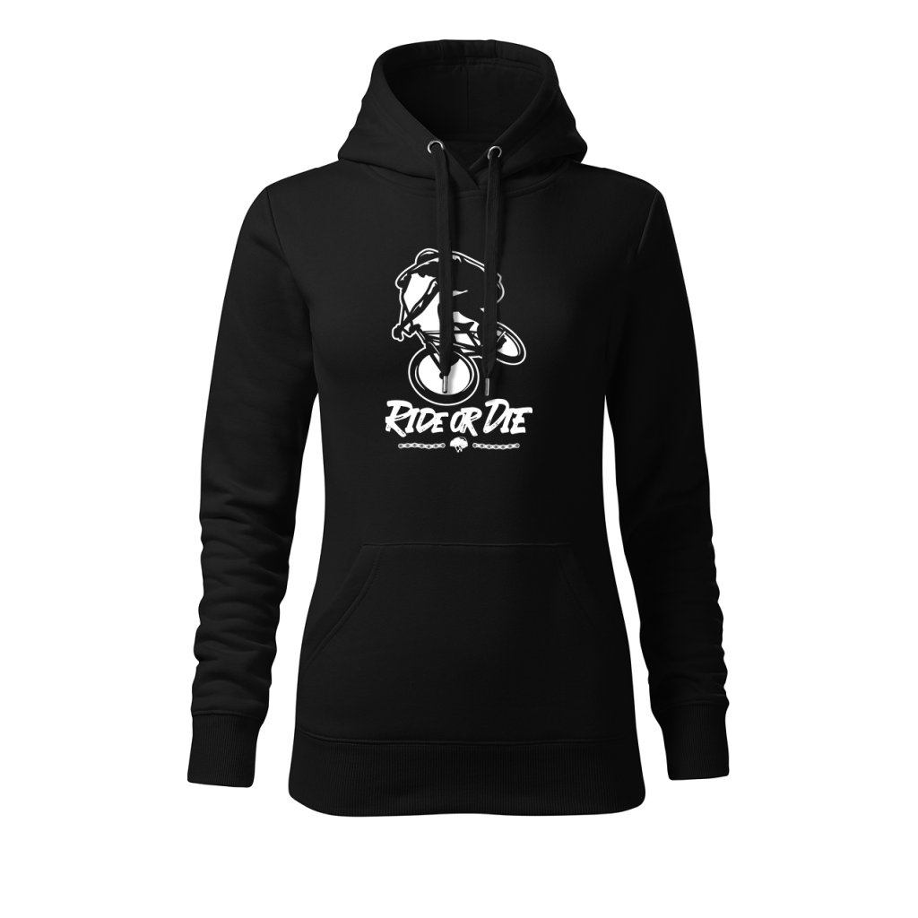 Pohodlná dámská mikina s kapucí, ideální na chladnější dny nebo večerní ježdění. Freestyle kolo ve skoku a slogan „Ride or Die“ dává všem vědět, že jsi bikerka tělem i duší.