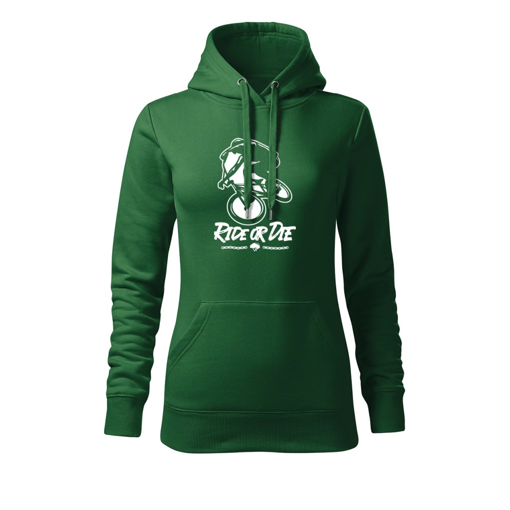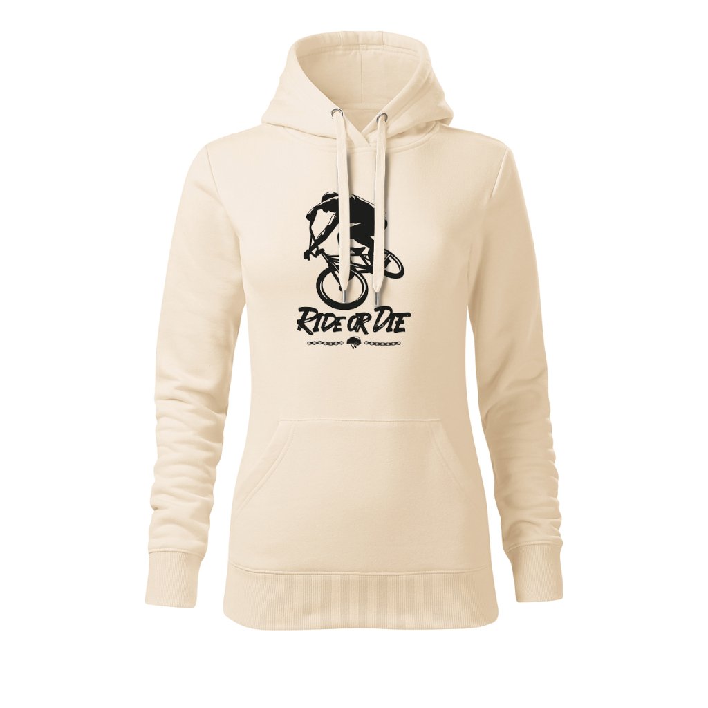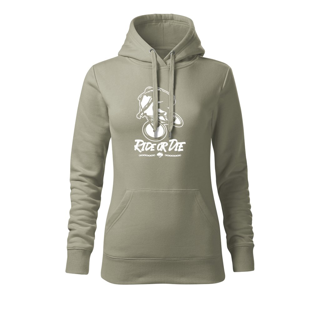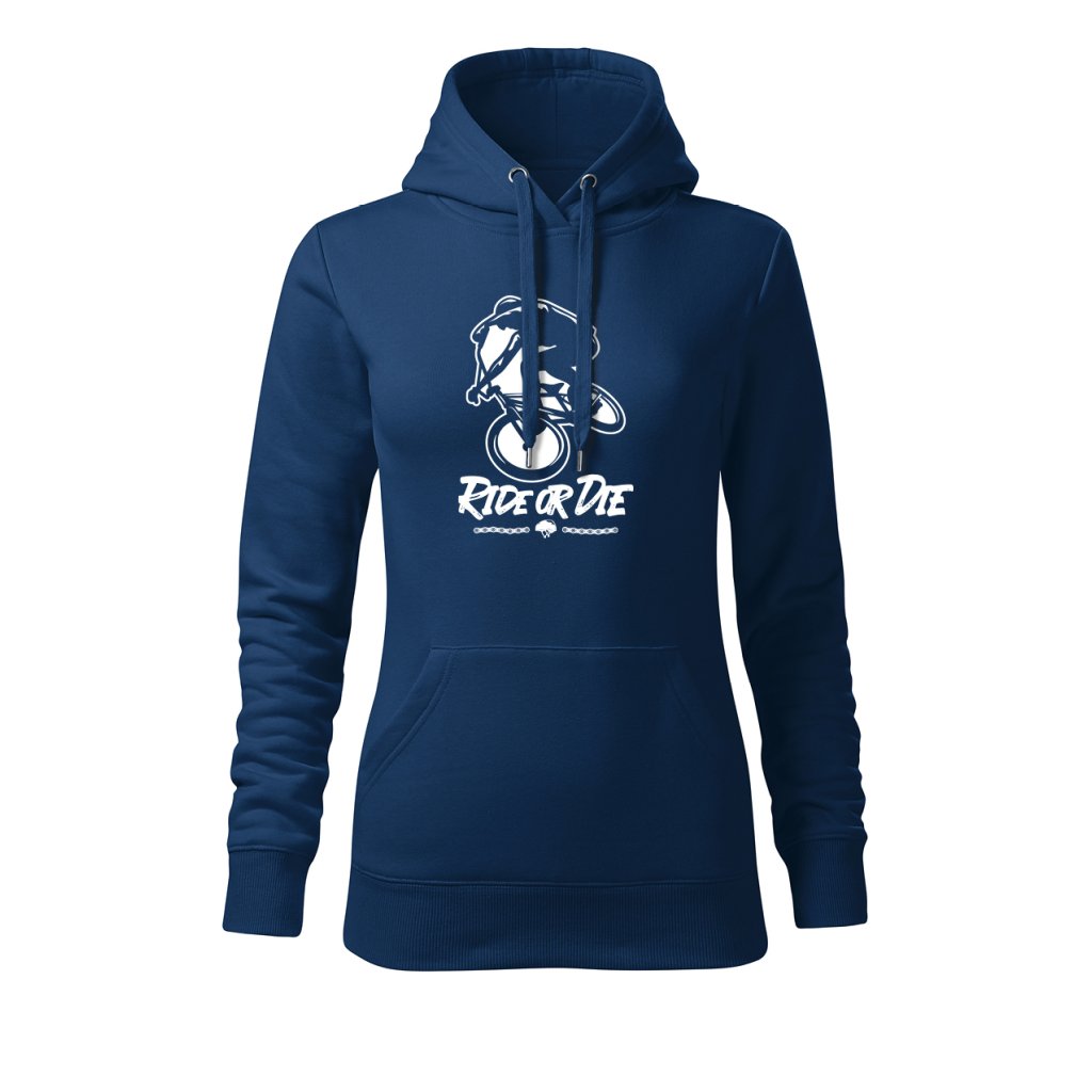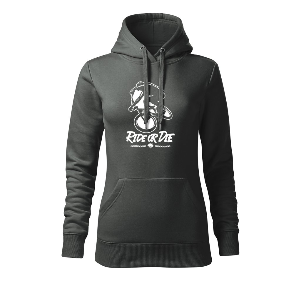 Pohodlná dámská mikina s kapucí, ideální na chladnější dny nebo večerní ježdění. Freestyle kolo ve skoku a slogan „Ride or Die“ dává všem vědět, že jsi bikerka tělem i duší.