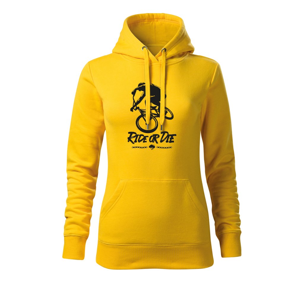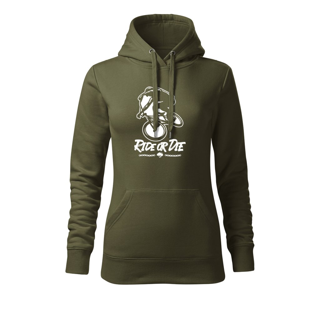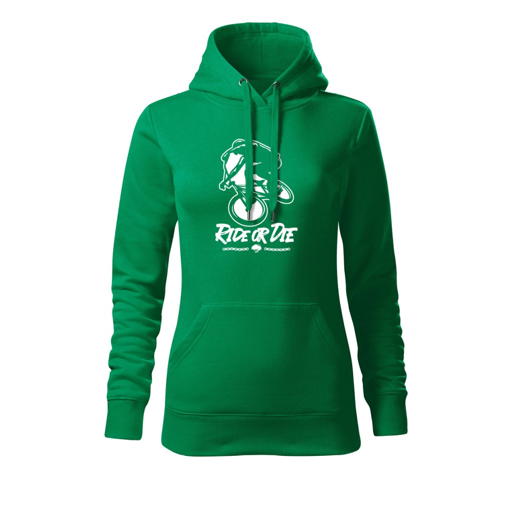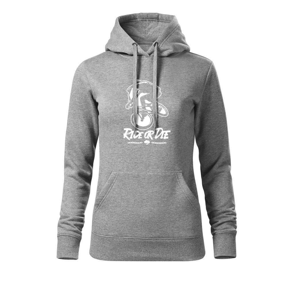 Pohodlná dámská mikina s kapucí, ideální na chladnější dny nebo večerní ježdění. Freestyle kolo ve skoku a slogan „Ride or Die“ dává všem vědět, že jsi bikerka tělem i duší.