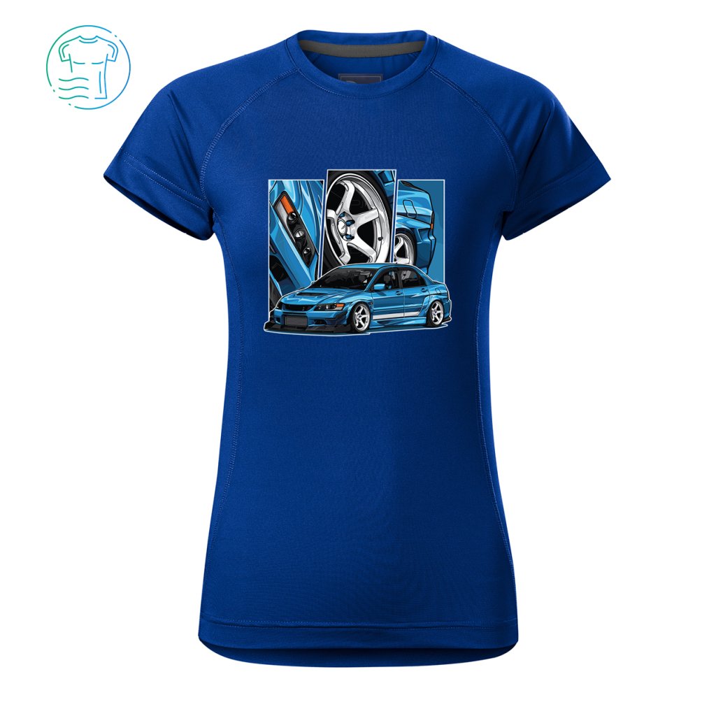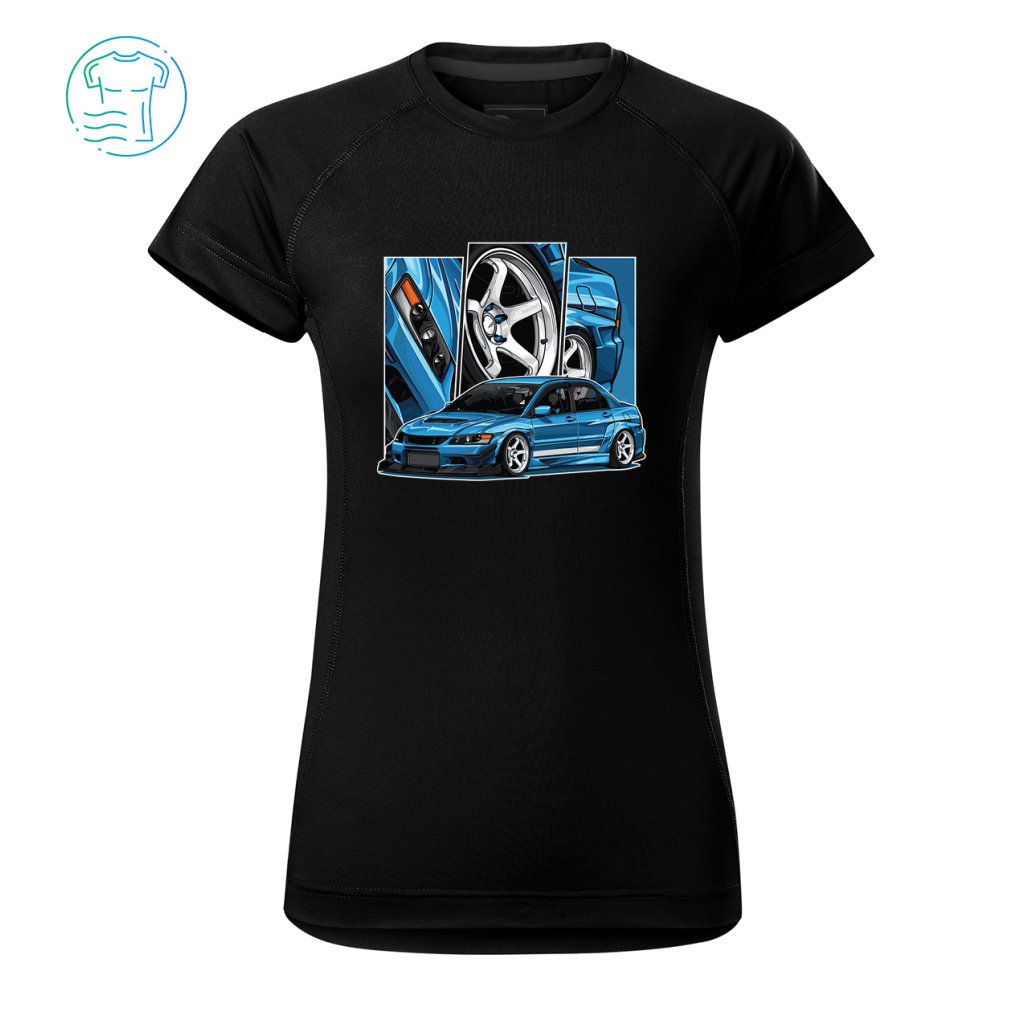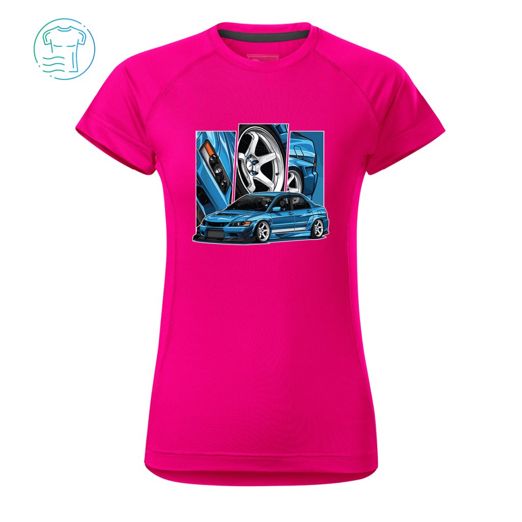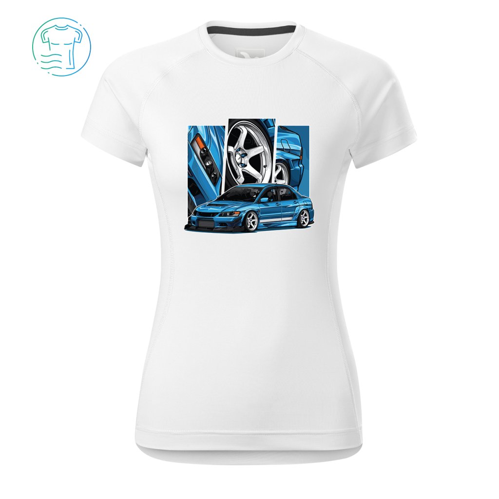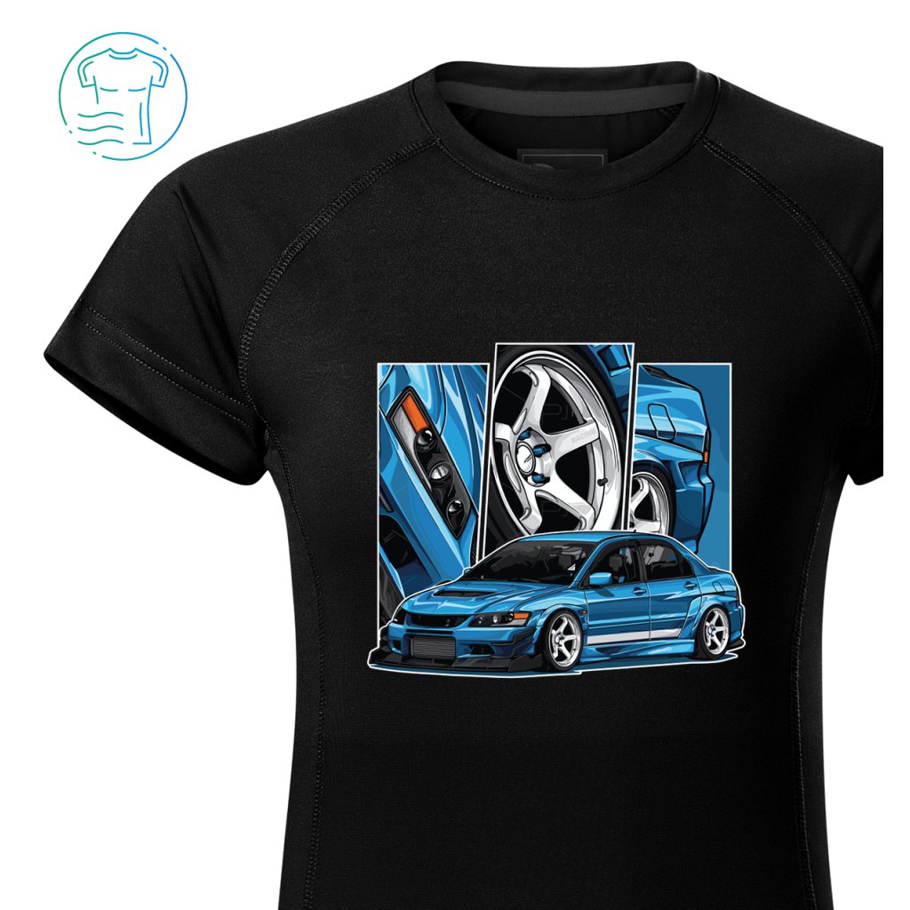 Sportovní tričko pro ženy, které milují rychlost, styl a svobodu pohybu. Grafika modrého Mitsubishi Lancer EVO v JDM stylu dodává tričku výraz a osobnost – zcela jako ty. Lehký, rychleschnoucí materiál oceníš při tréninku i na procházce městem. Vůně benzínu není povinná, ale špetka vášně pro auta se hodí.