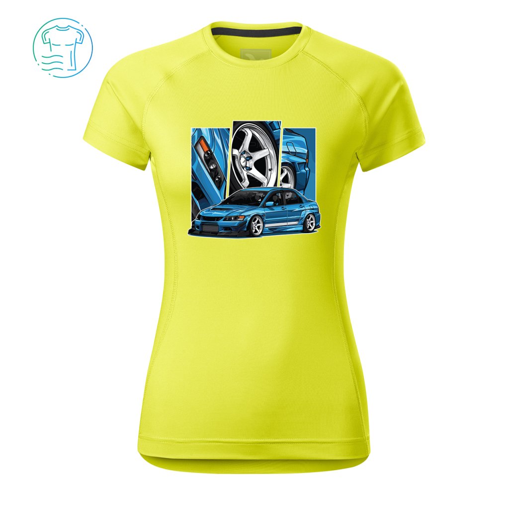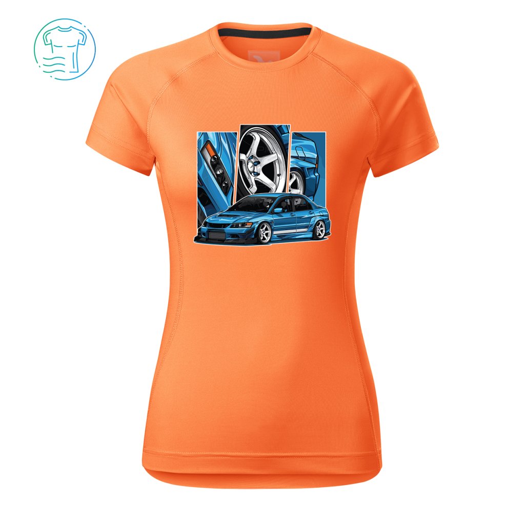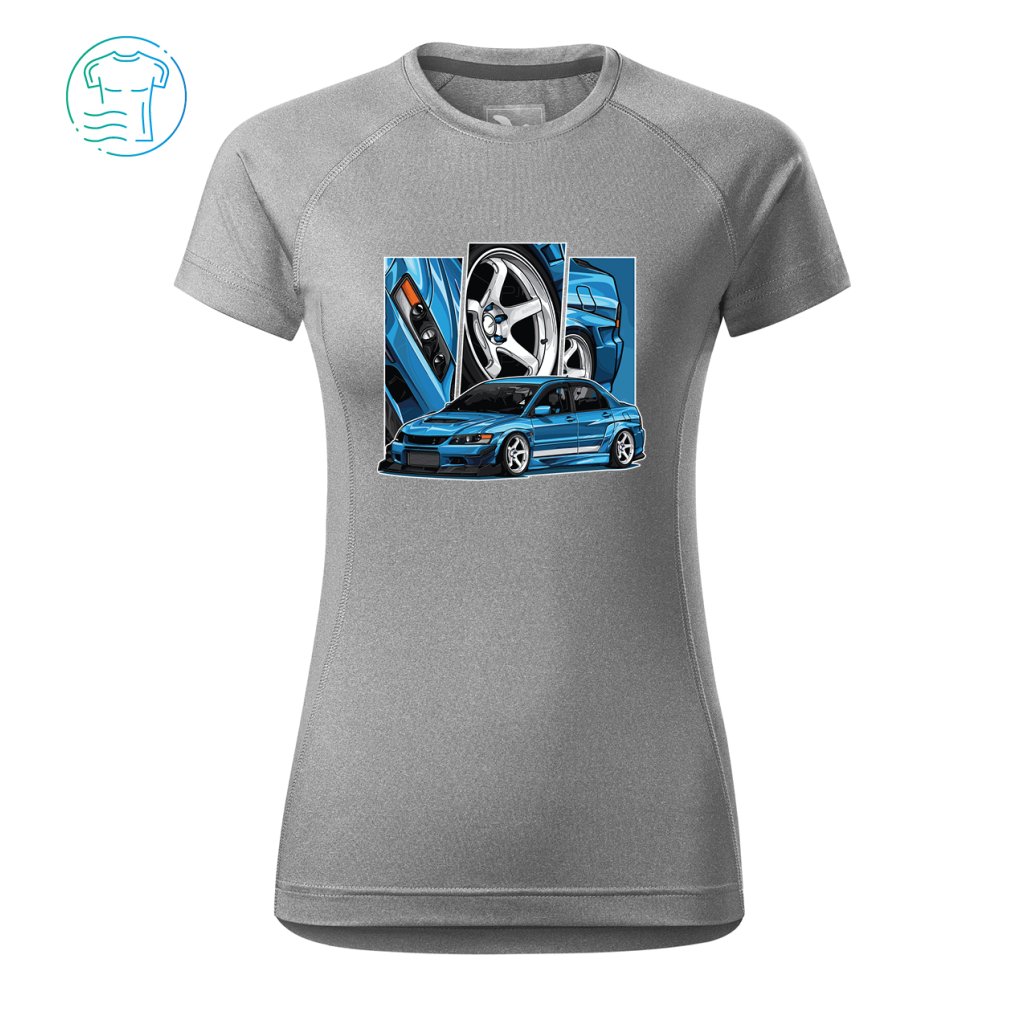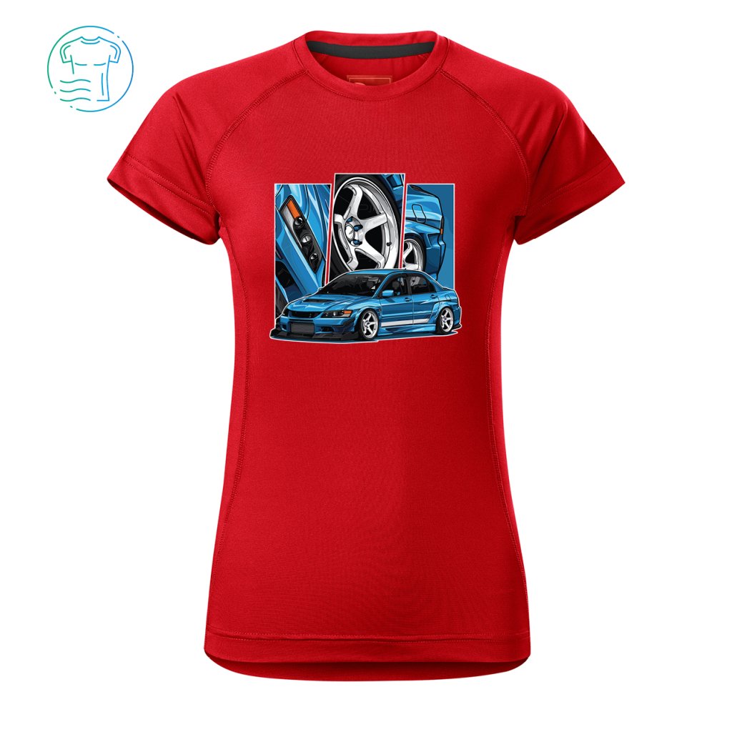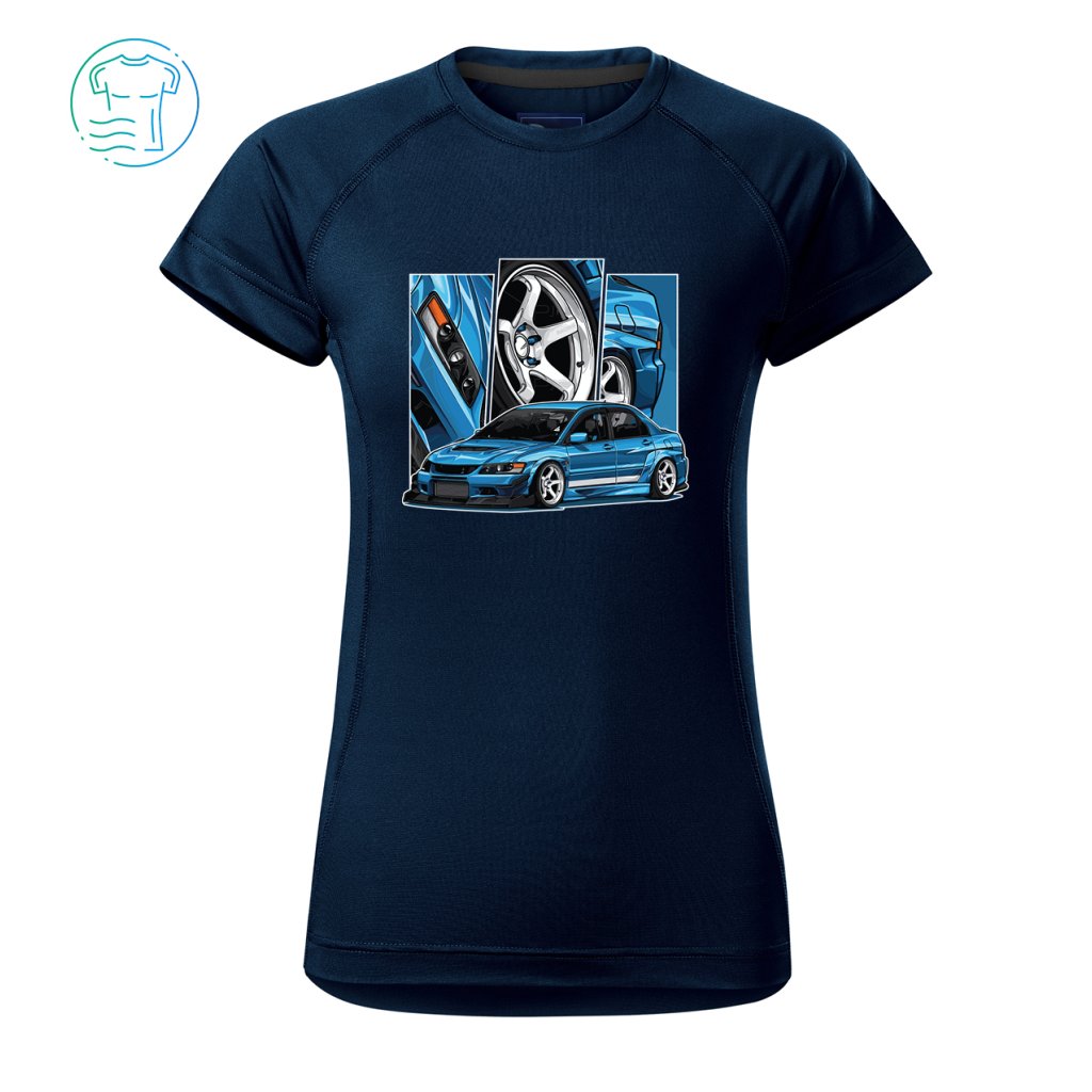 Sportovní tričko pro ženy, které milují rychlost, styl a svobodu pohybu. Grafika modrého Mitsubishi Lancer EVO v JDM stylu dodává tričku výraz a osobnost – zcela jako ty. Lehký, rychleschnoucí materiál oceníš při tréninku i na procházce městem. Vůně benzínu není povinná, ale špetka vášně pro auta se hodí.