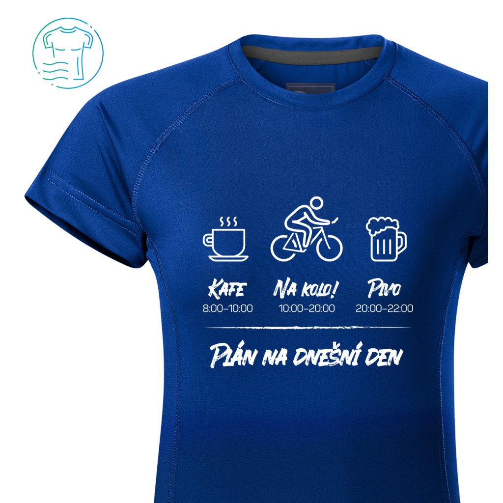 Když si chceš dát do těla a zároveň to brát s humorem. Sportovní tričko z funkčního materiálu s potiskem tří ikon – kolo, káva, pivo – a výstižným textem „Plán na dnešní den“. Pro všechny ženy, co ví, že cyklistika je víc než sport – je to životní styl.