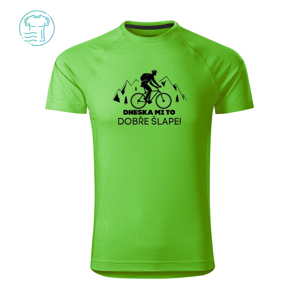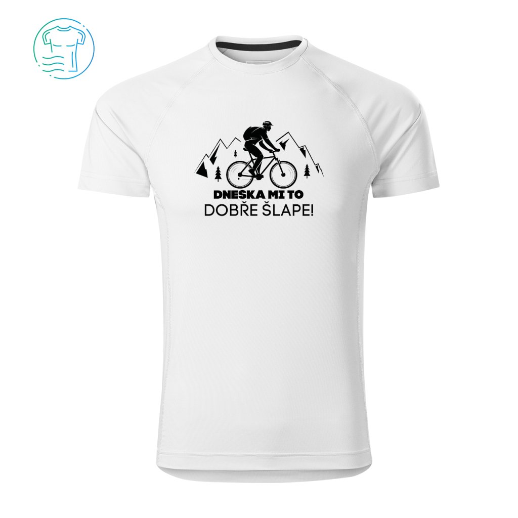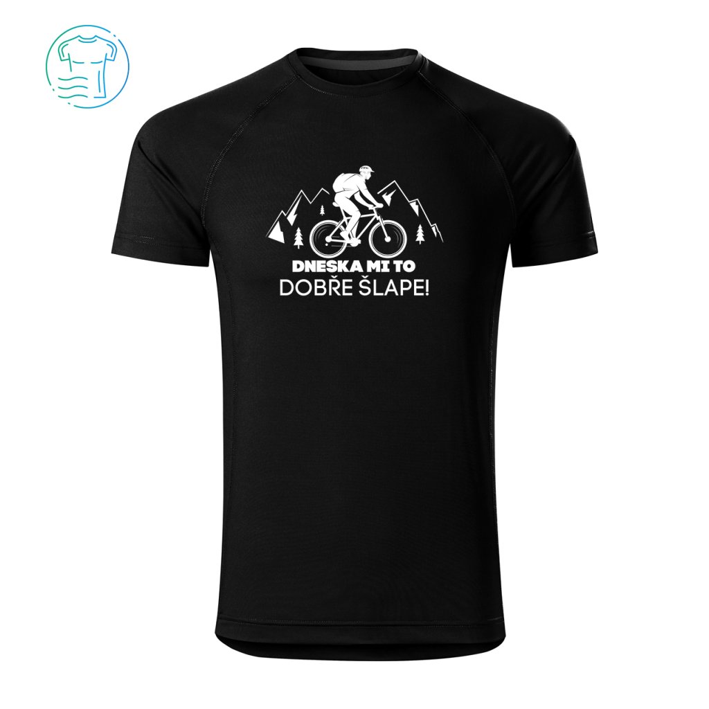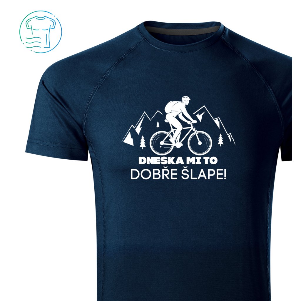 Funkční sportovní tričko s nápisem "Dneska mi to dobře šlape", s potiskem hor a cyklisty.