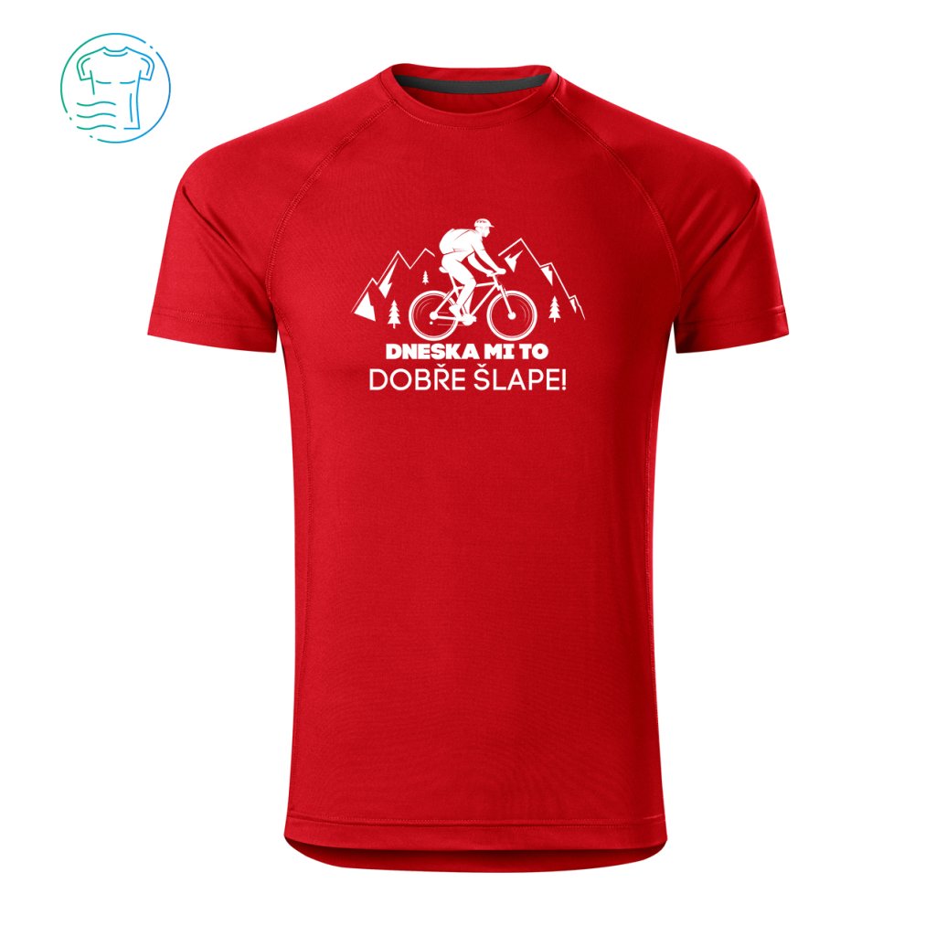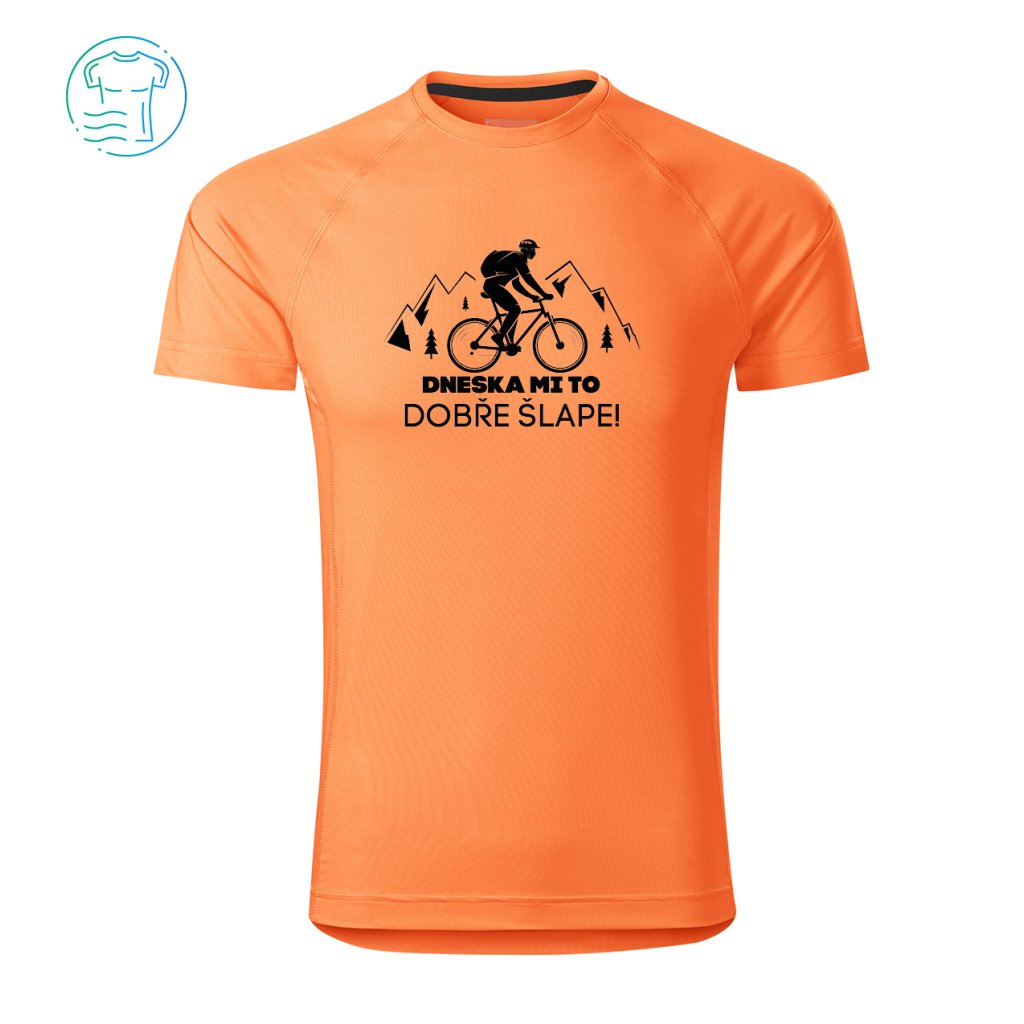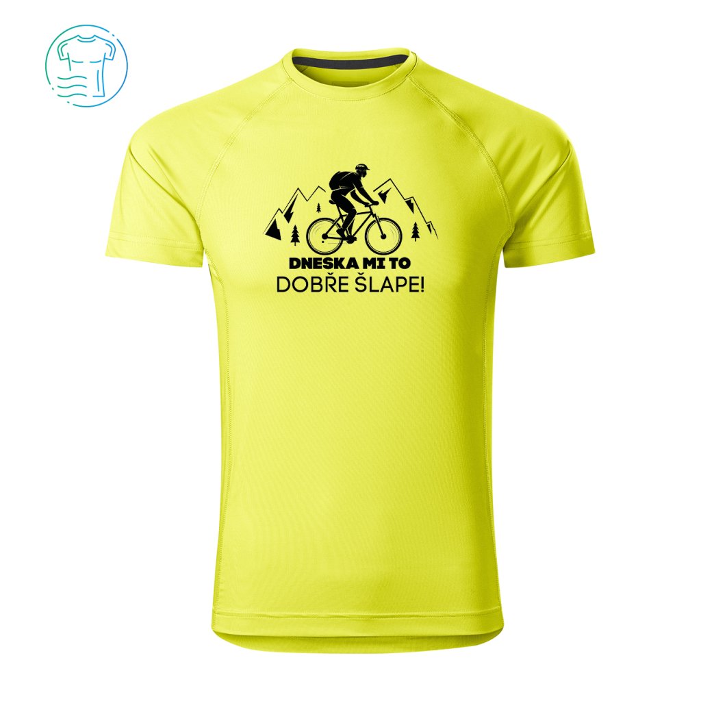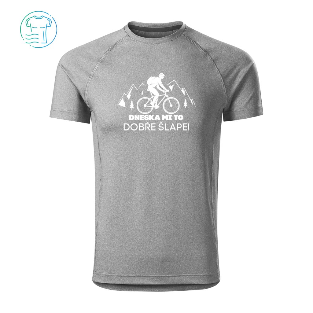 Funkční sportovní tričko s nápisem "Dneska mi to dobře šlape", s potiskem hor a cyklisty.
