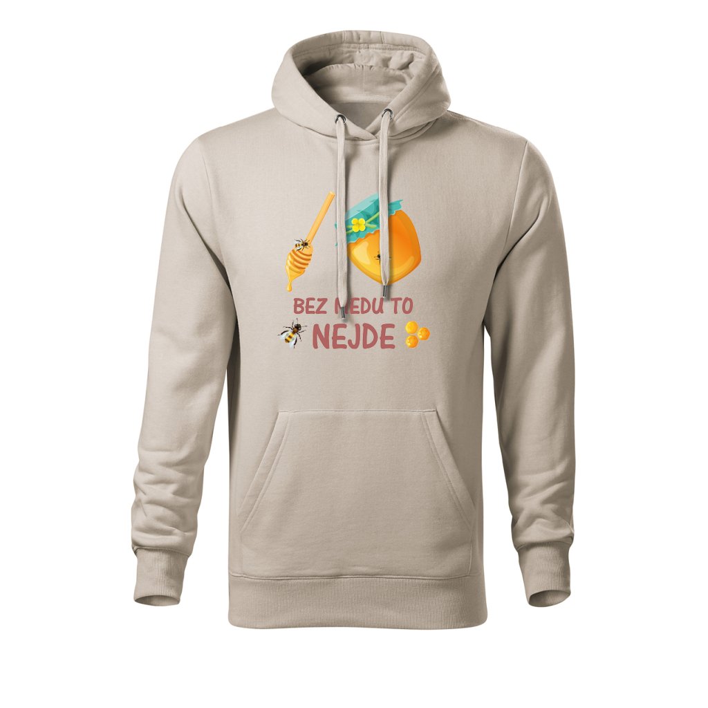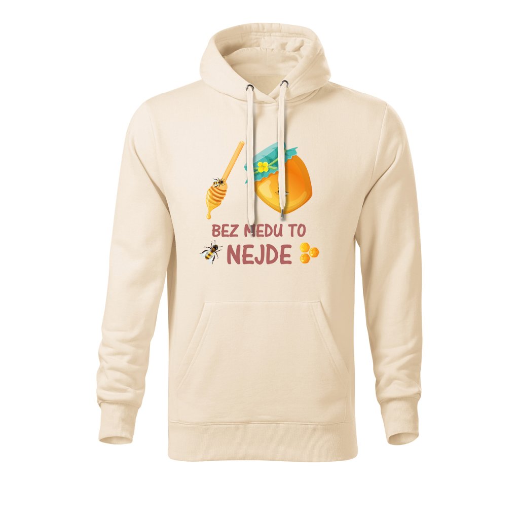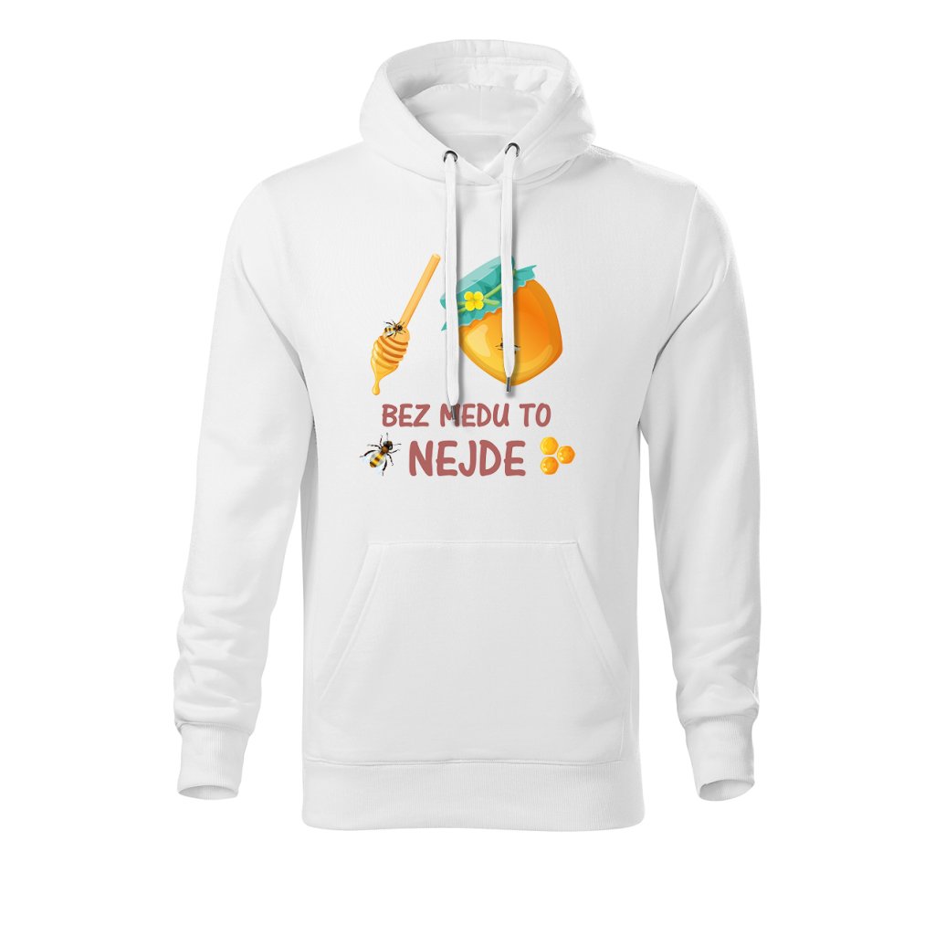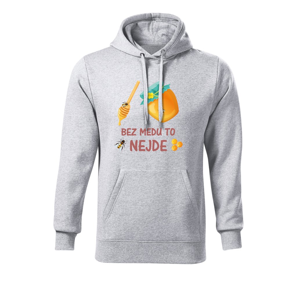 Nápis "Bez medu to nejde" a obrázek medu na pánské mikině s kapucí.