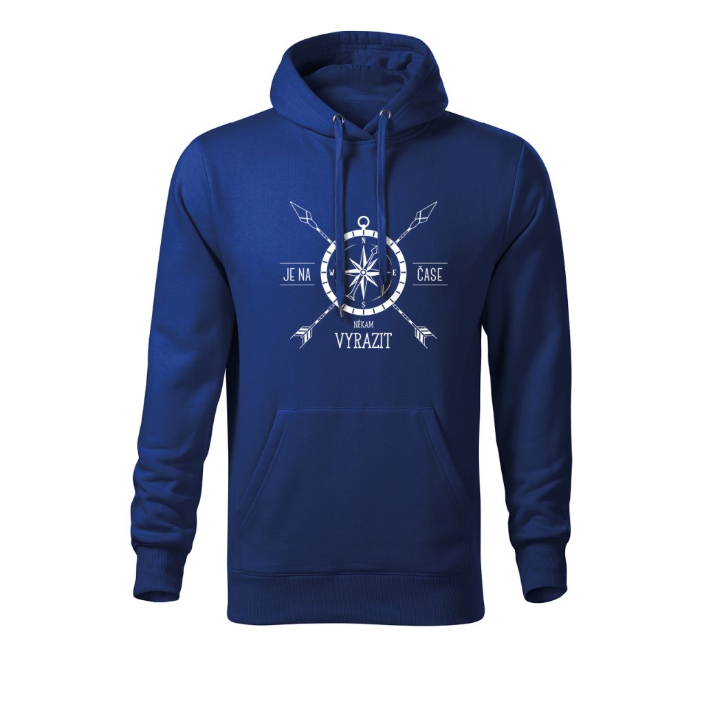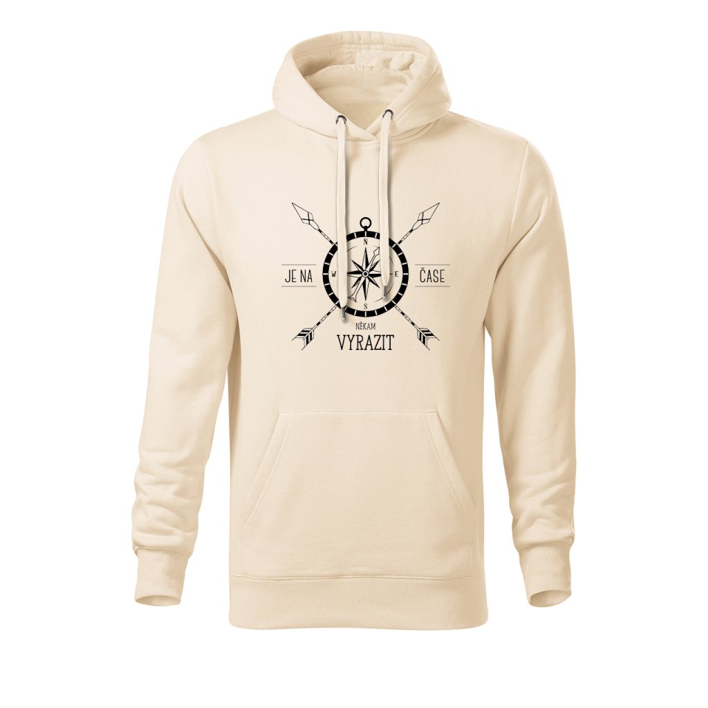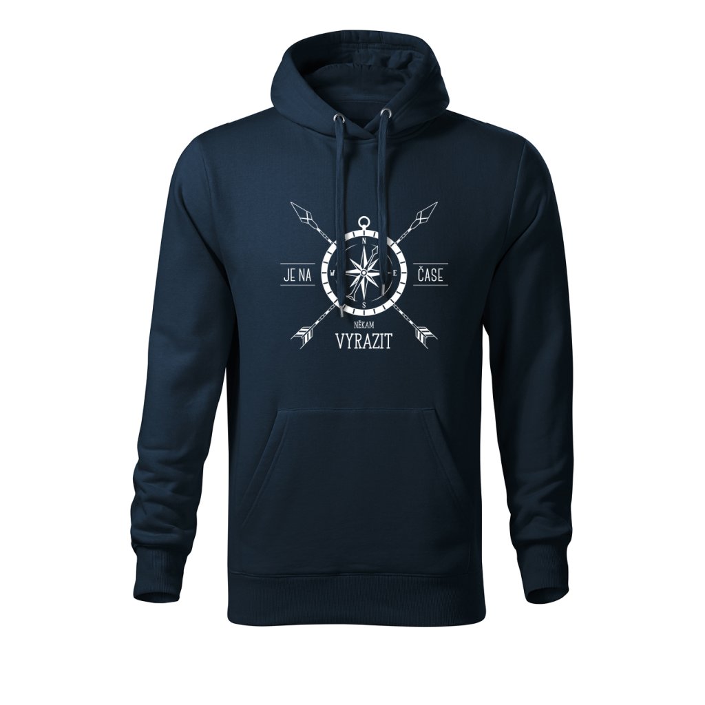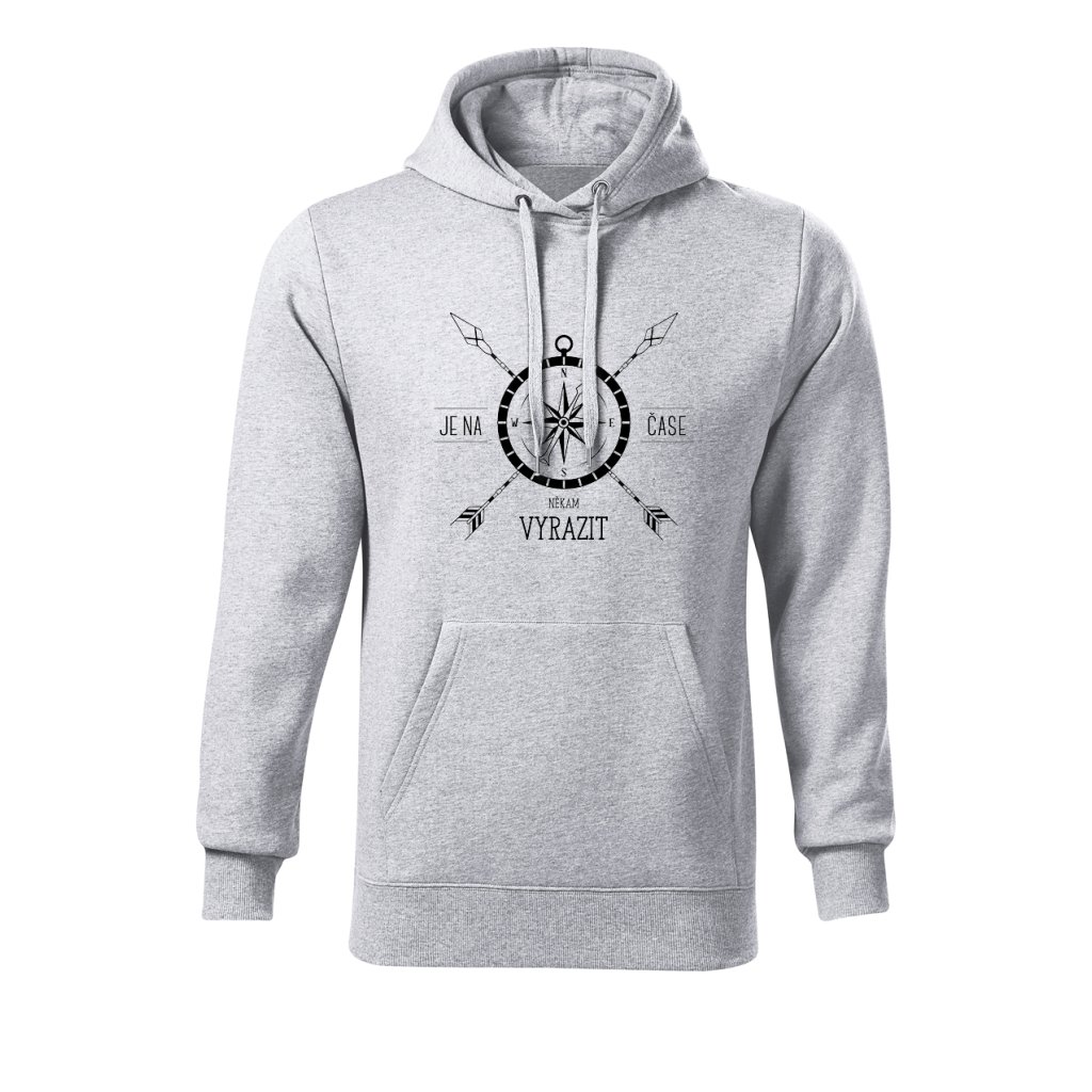 Obrázek kompasu, nápis "Je na čase někam vyrazit" na stylové pánské mikině.