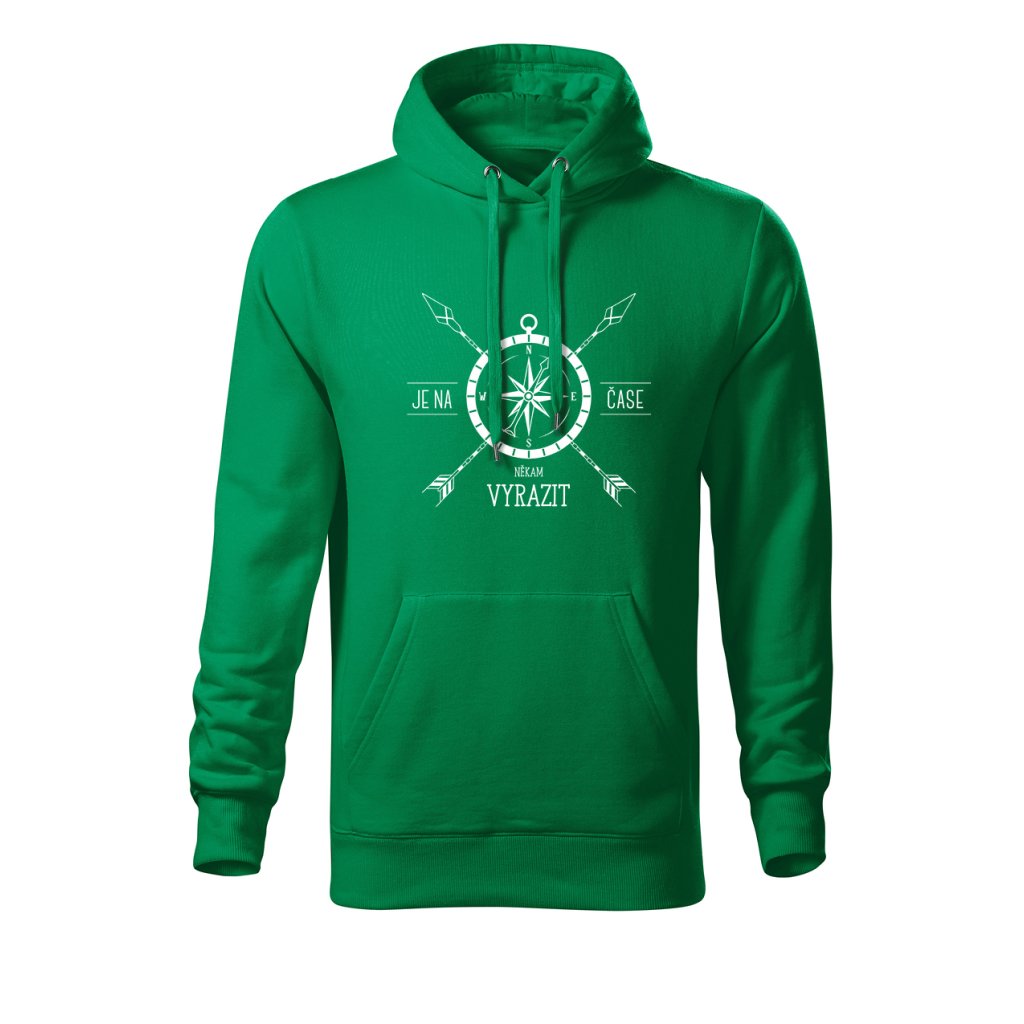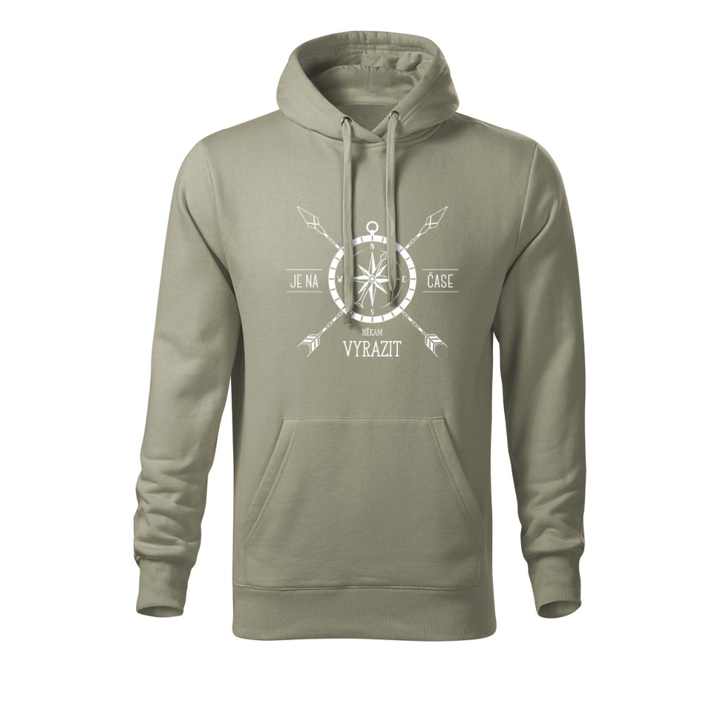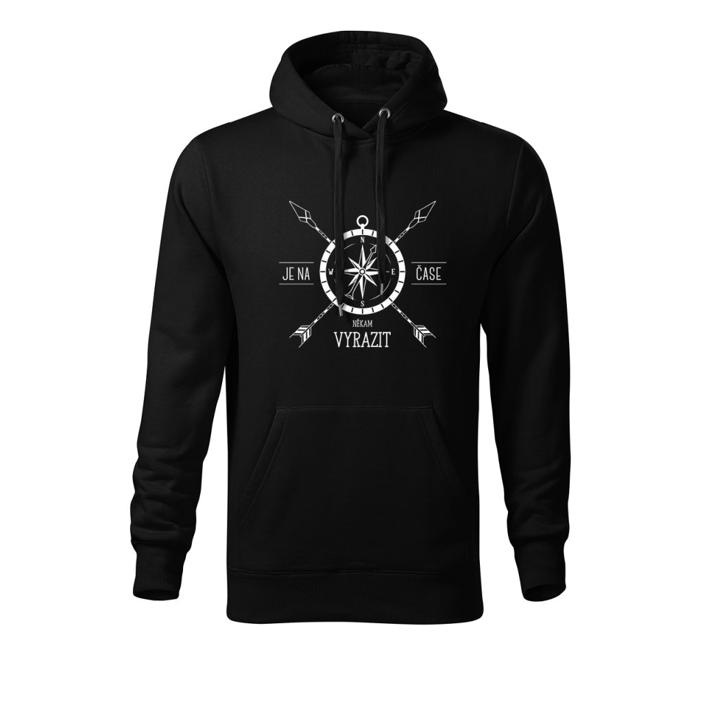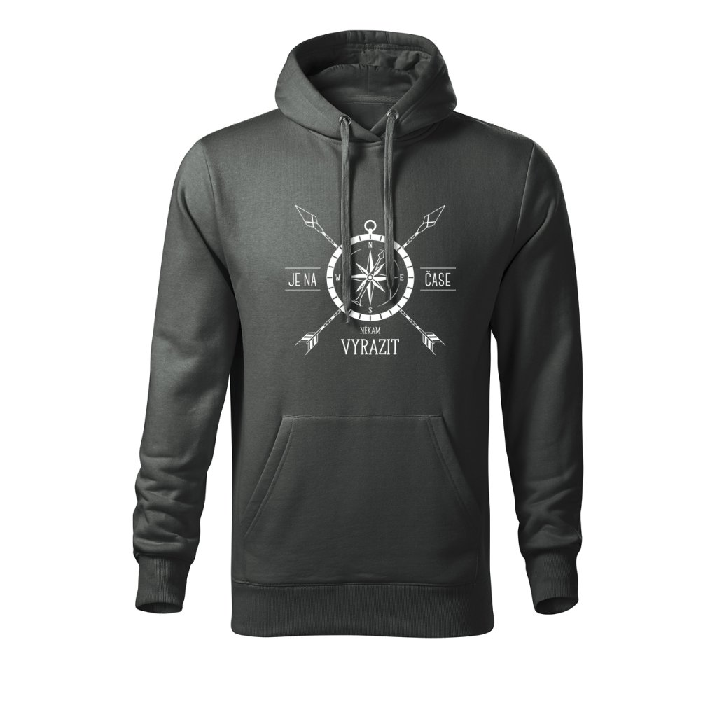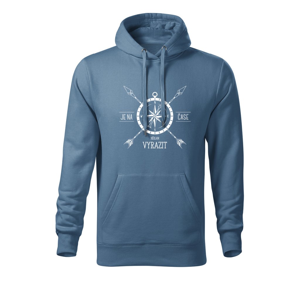 Obrázek kompasu, nápis "Je na čase někam vyrazit" na stylové pánské mikině.