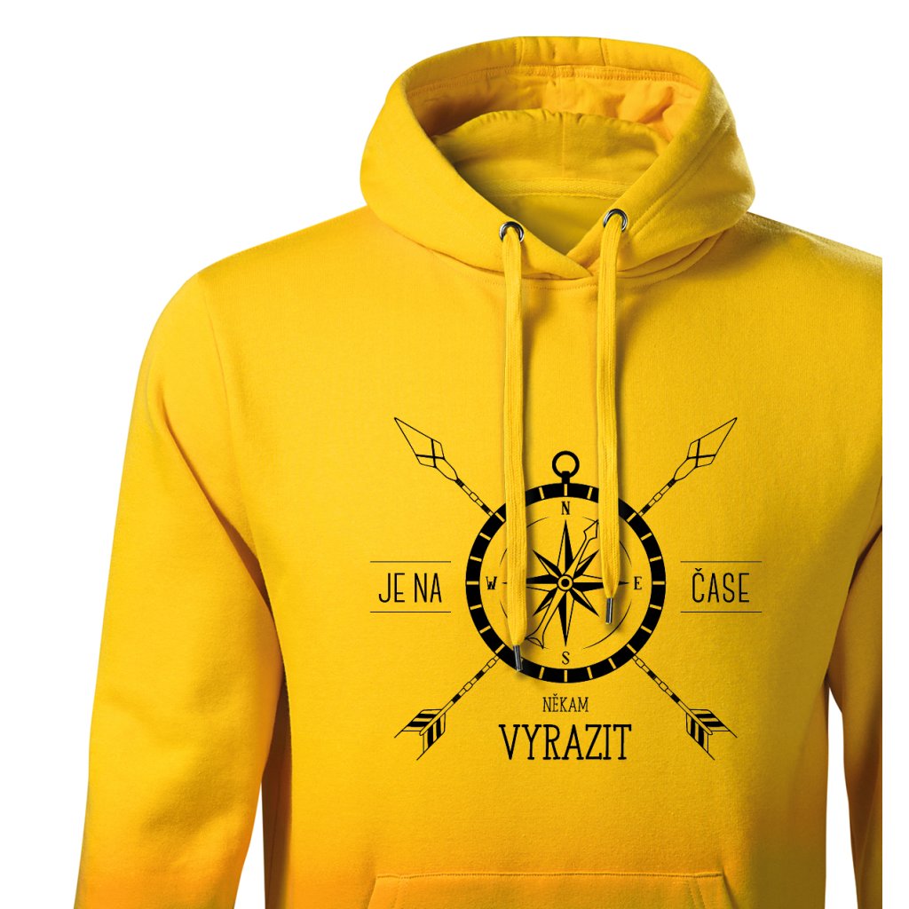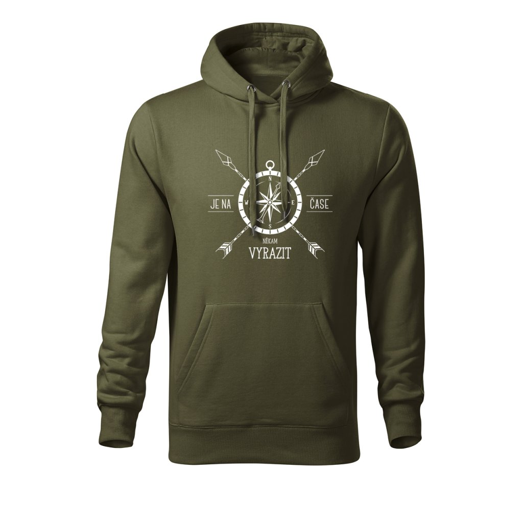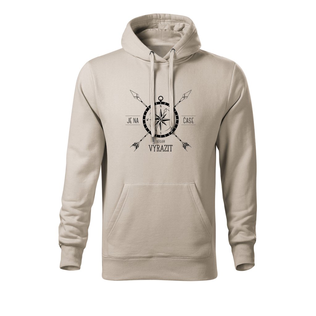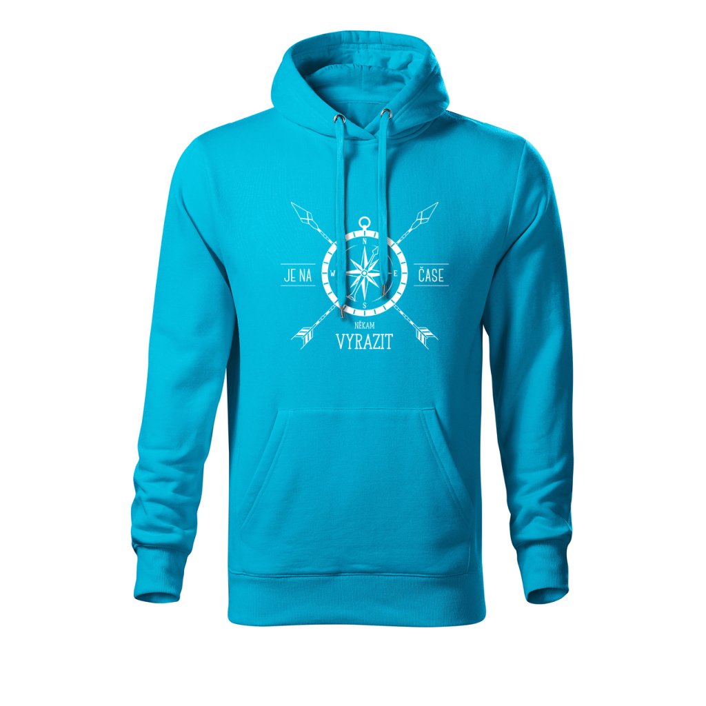 Obrázek kompasu, nápis "Je na čase někam vyrazit" na stylové pánské mikině.