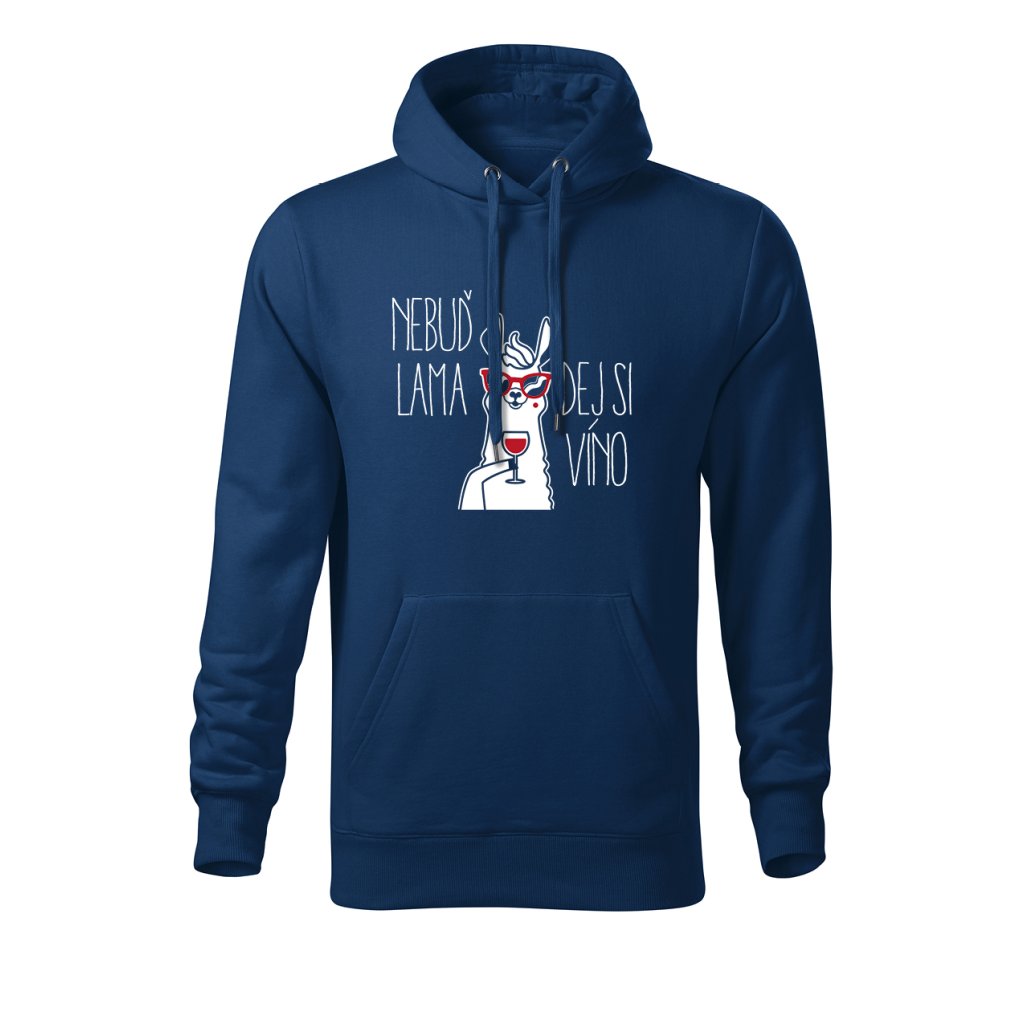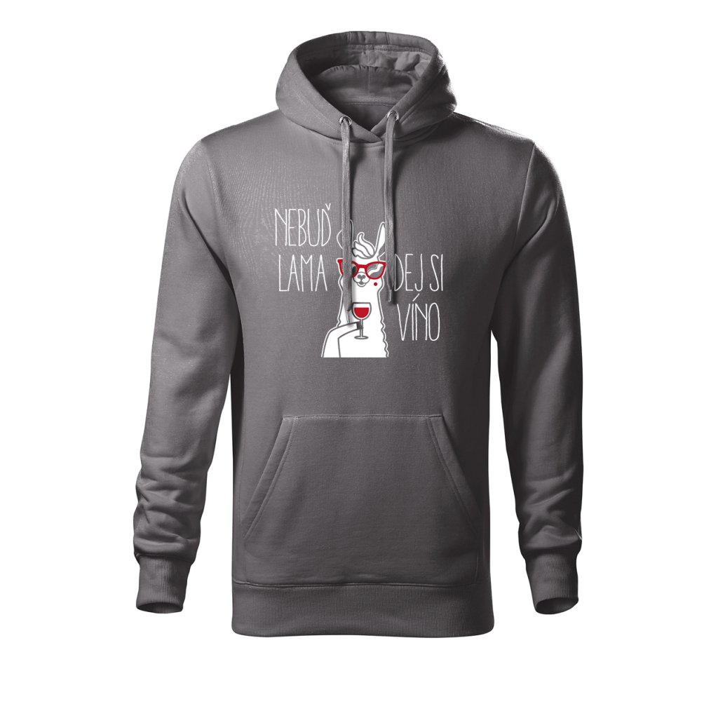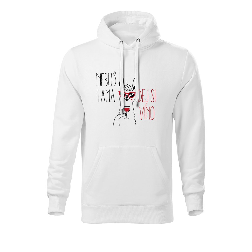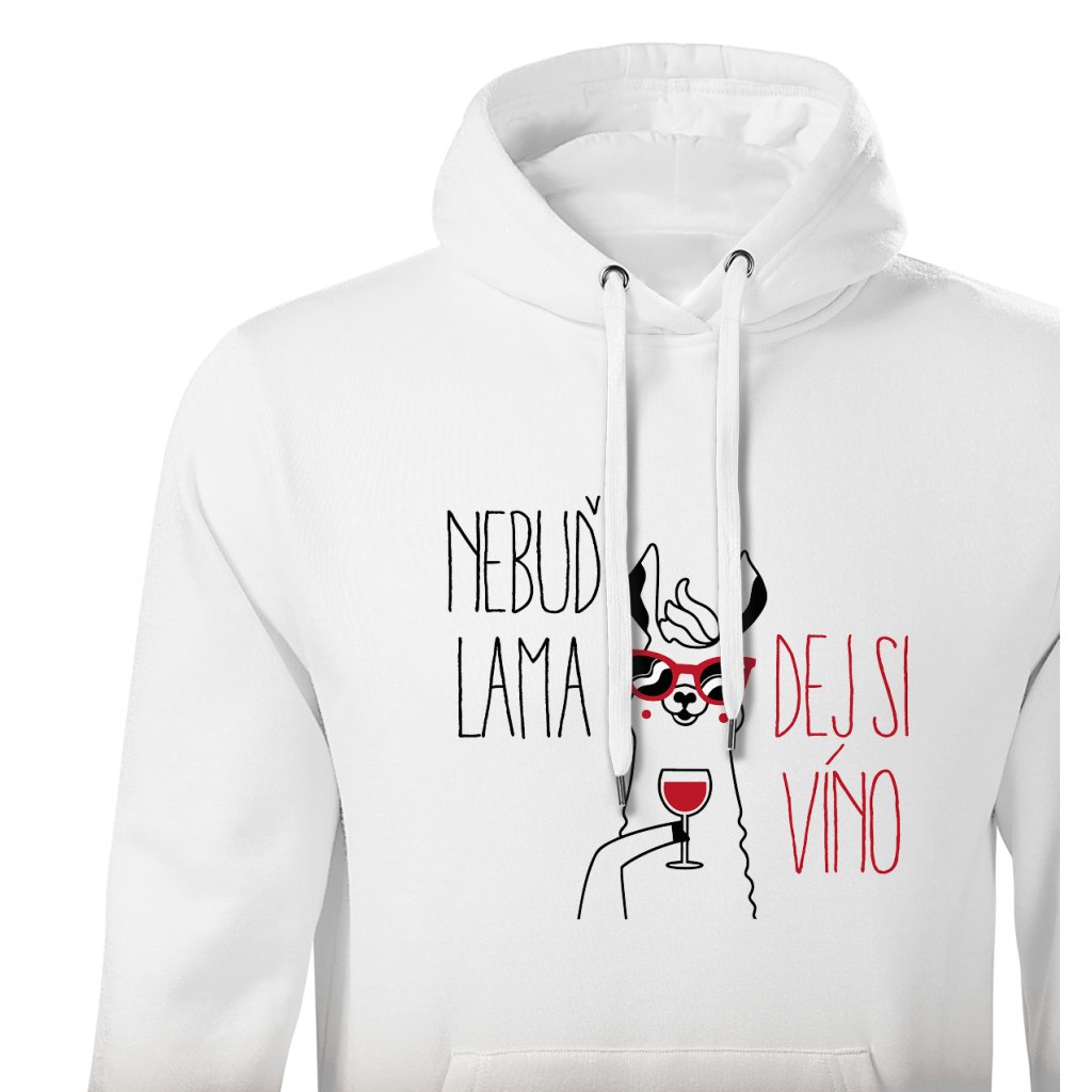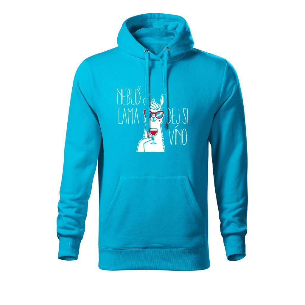 Teplá mikina s kapucí s motivem lamy popíjející víno a nápisem "Nebuď lama, dej si víno" spojuje pohodlí s veselým designem. Ideální na chladnější večery, výlety na vinařskou stezku nebo domácí relax u krbu.
