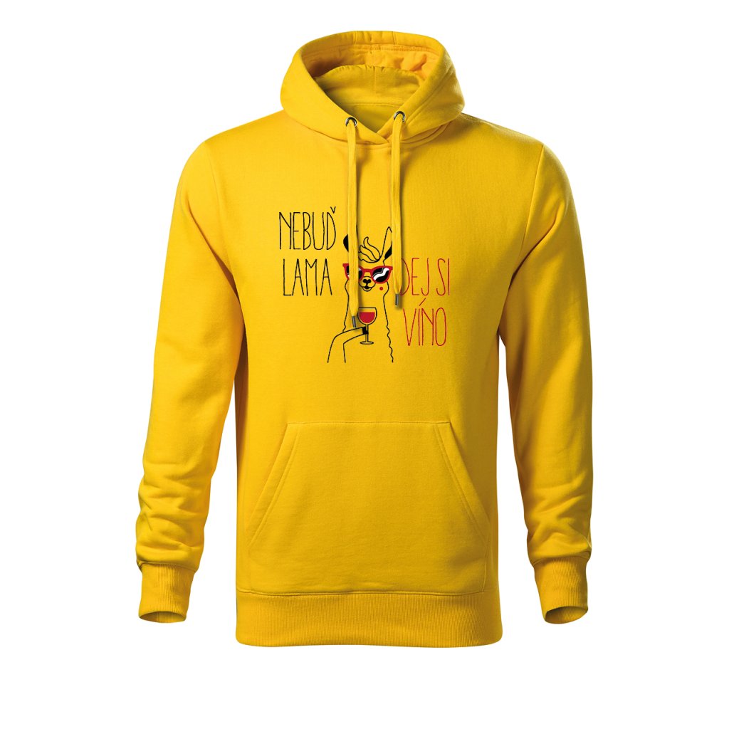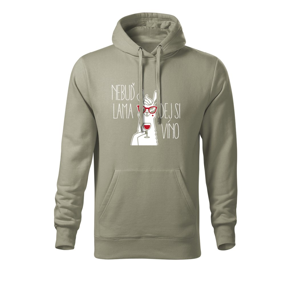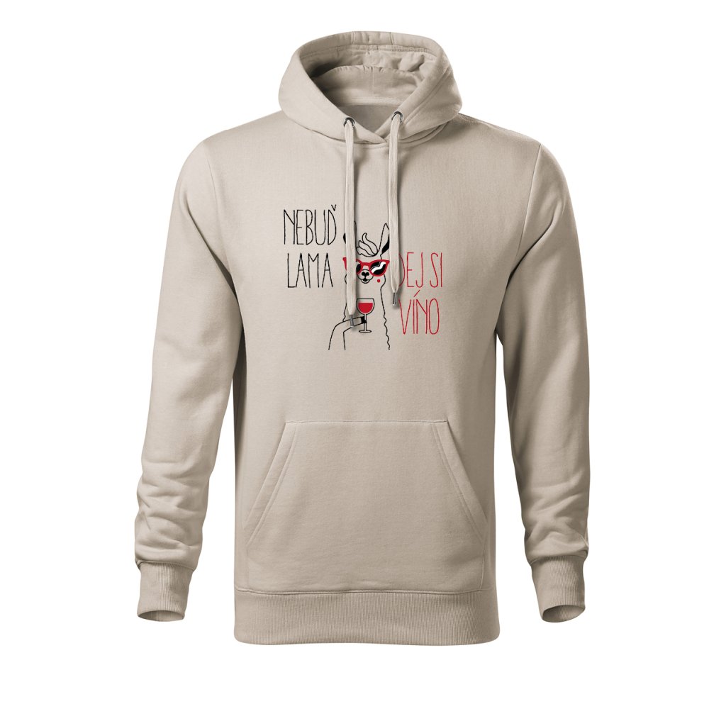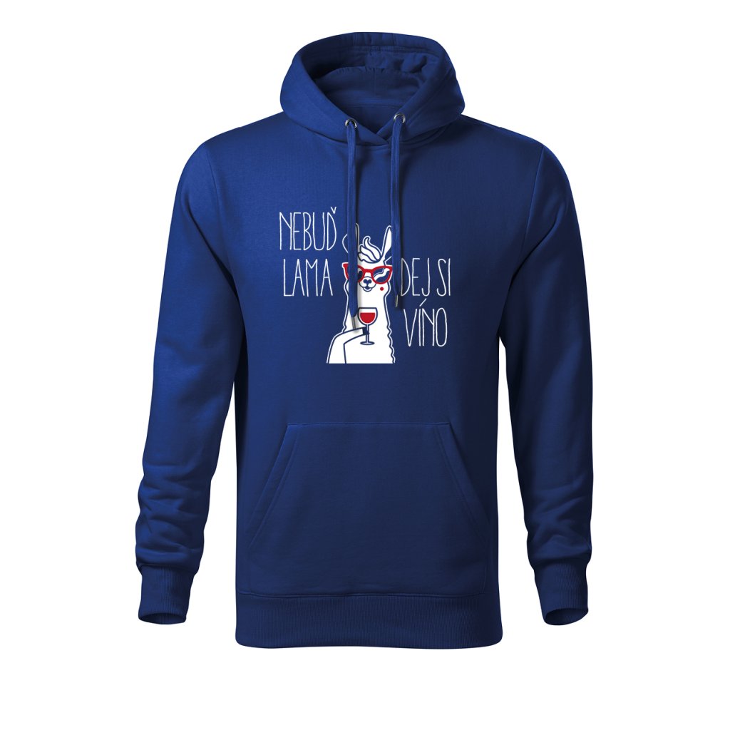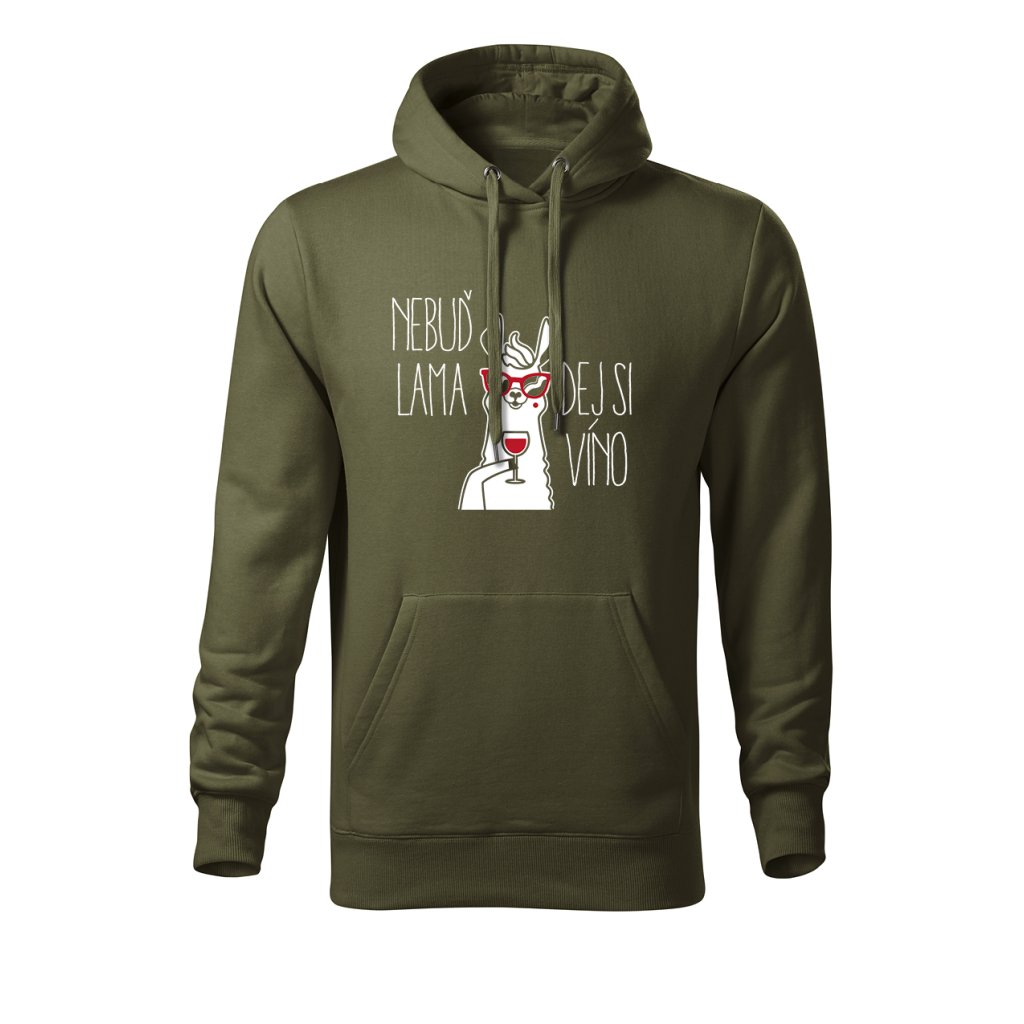 Teplá mikina s kapucí s motivem lamy popíjející víno a nápisem "Nebuď lama, dej si víno" spojuje pohodlí s veselým designem. Ideální na chladnější večery, výlety na vinařskou stezku nebo domácí relax u krbu.