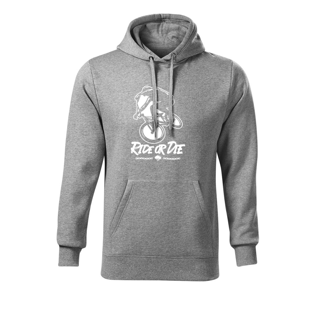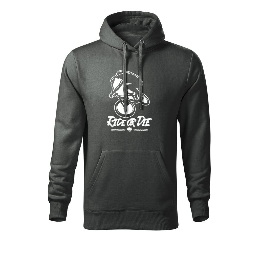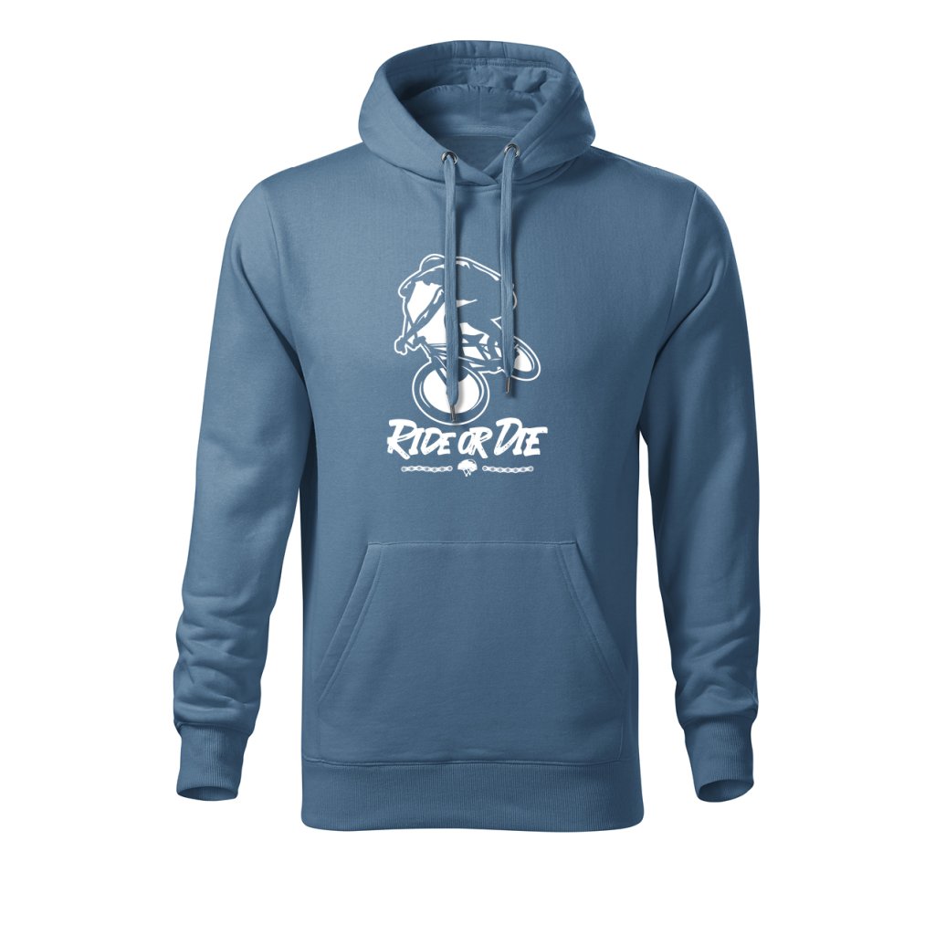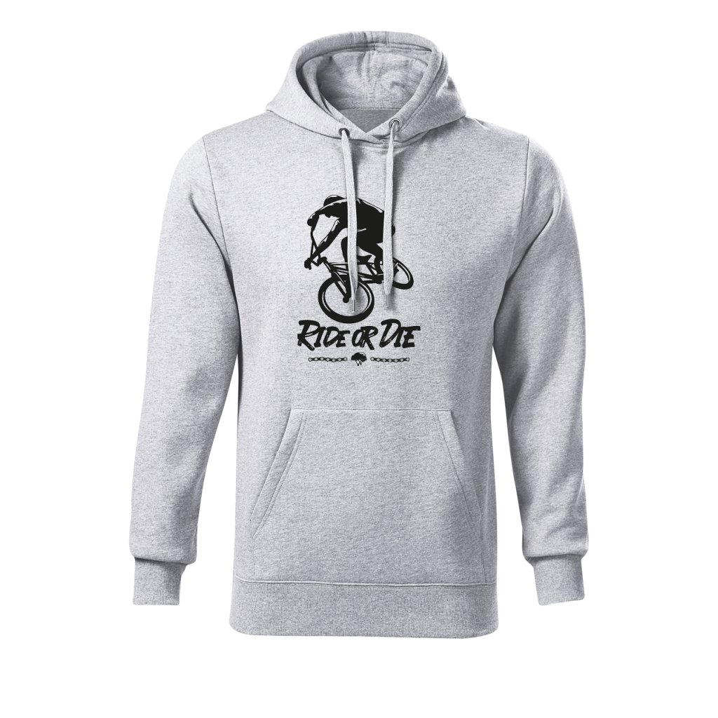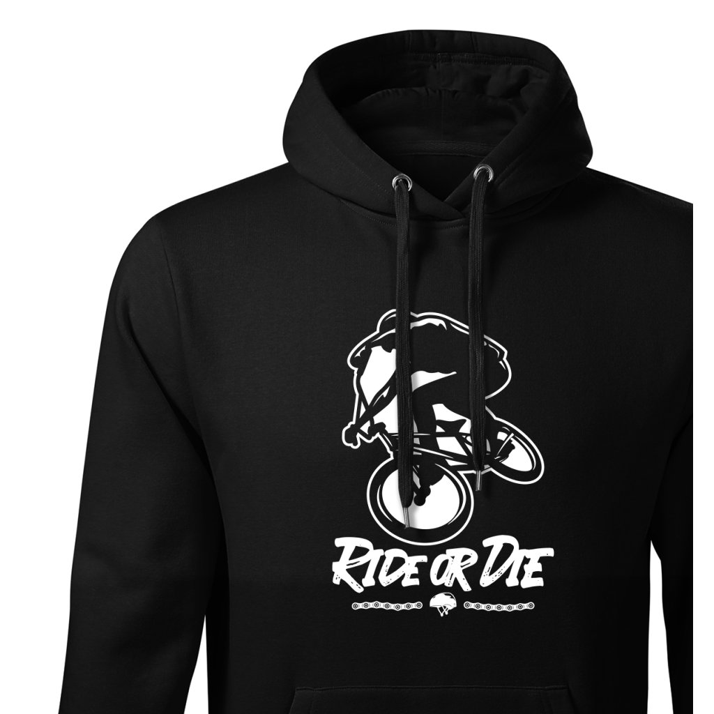 Pánská mikina s kapucí s výrazným potiskem – Freestyle kolo ve skoku a heslo „Ride or Die“. Vhodné na triky, na pivo i lehké projížďky. Akční tričko – jako tvoje jízda.
