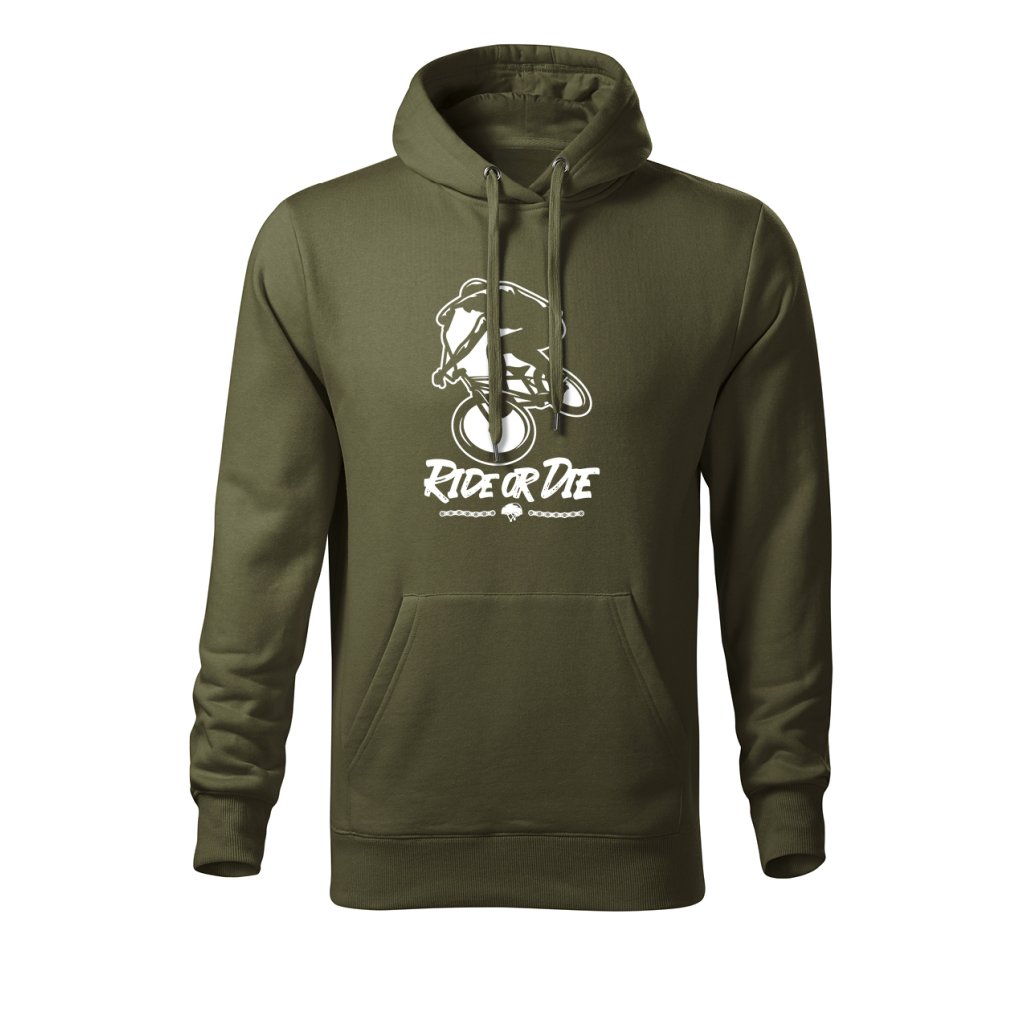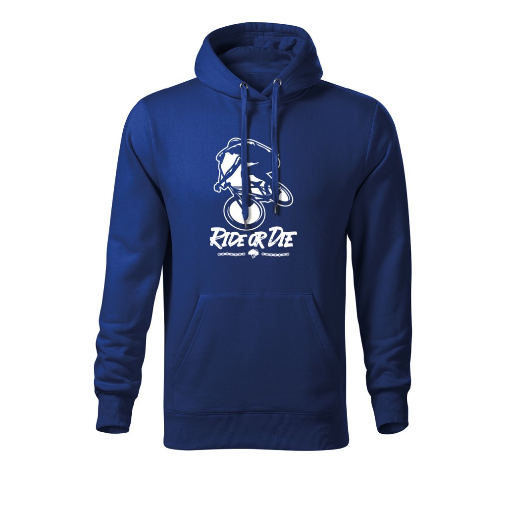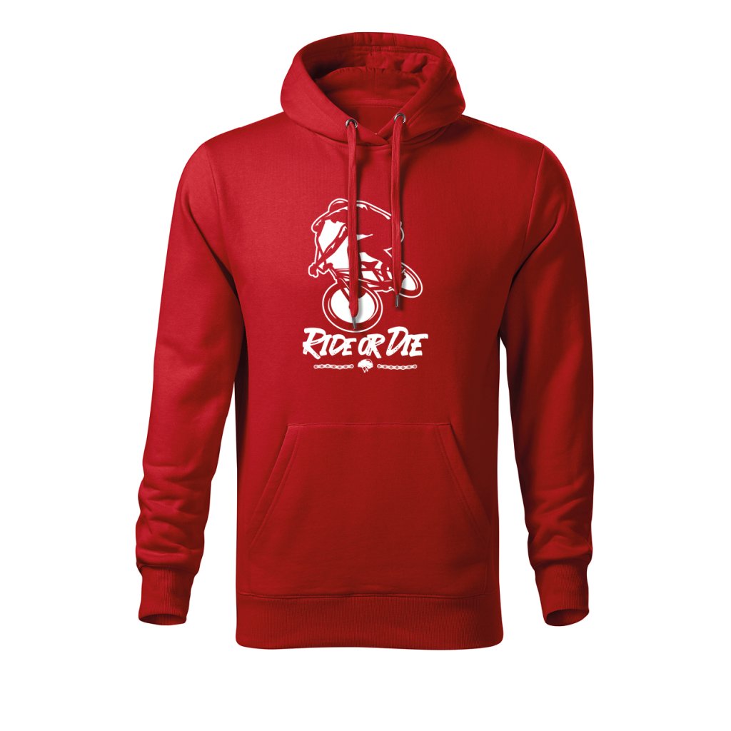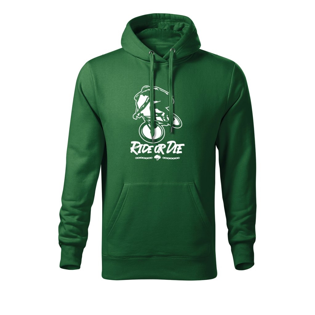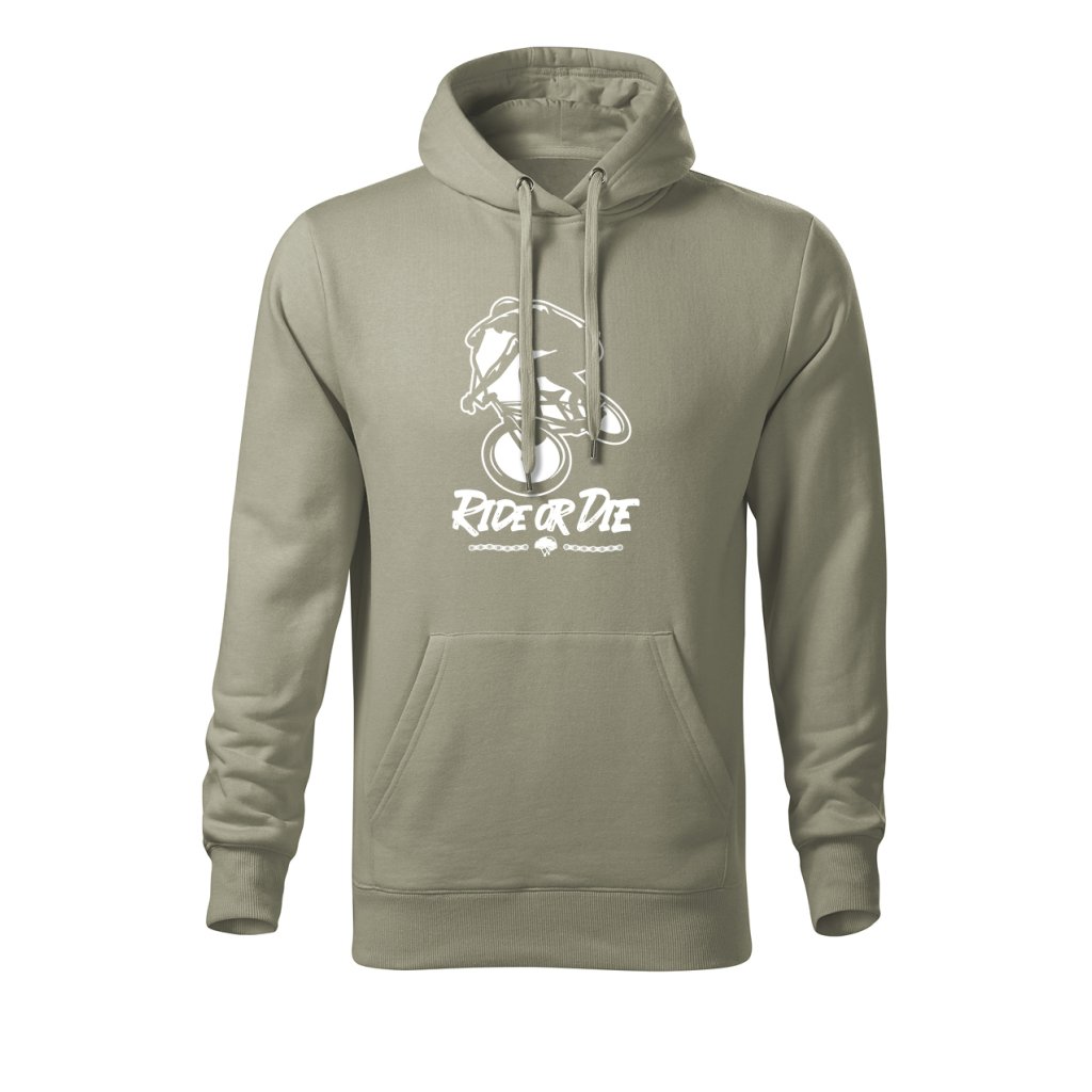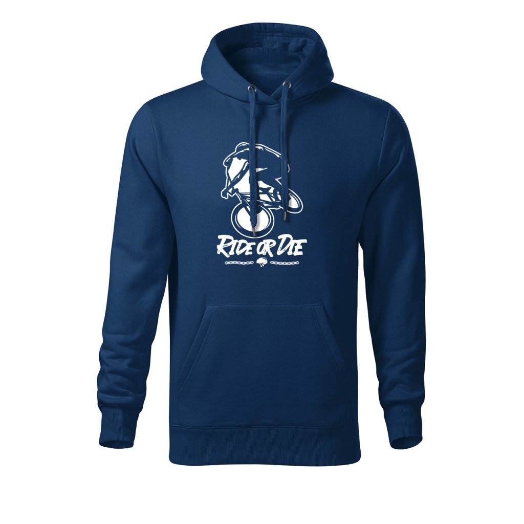 Pánská mikina s kapucí s výrazným potiskem – Freestyle kolo ve skoku a heslo „Ride or Die“. Vhodné na triky, na pivo i lehké projížďky. Akční tričko – jako tvoje jízda.