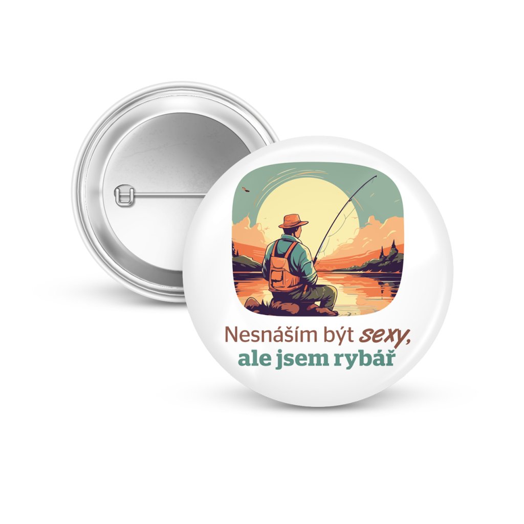Připínací placka (button) se špendlíkem, pro rybáře s textem "Nesnáším být sexy, ale jsem rybář".