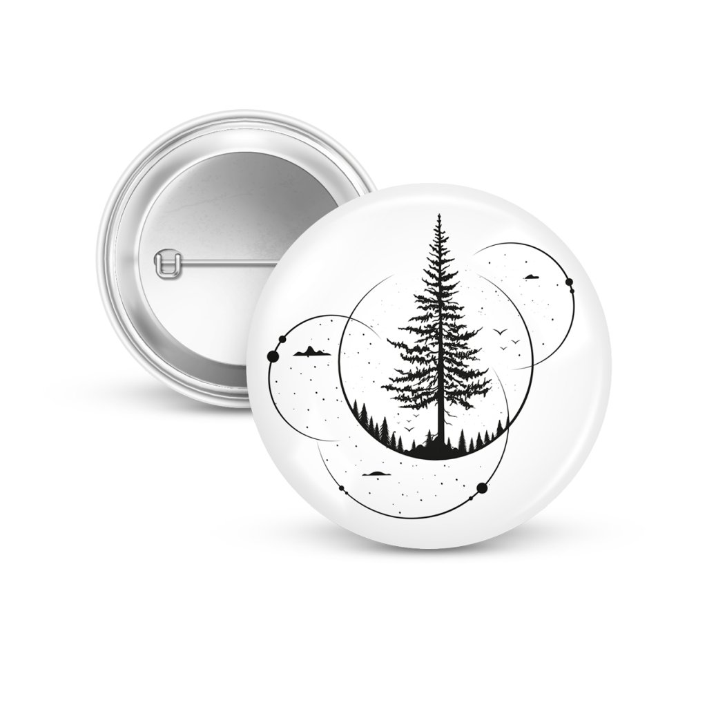 Připínací placka (button) se špendlíkem, s motivem siluety stromu.