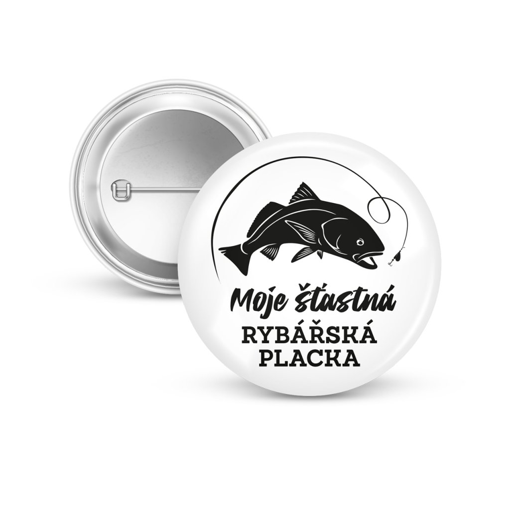 Připínací placka (button) se špendlíkem, pro rybáře s textem "Moje šťastná rybářská placka".