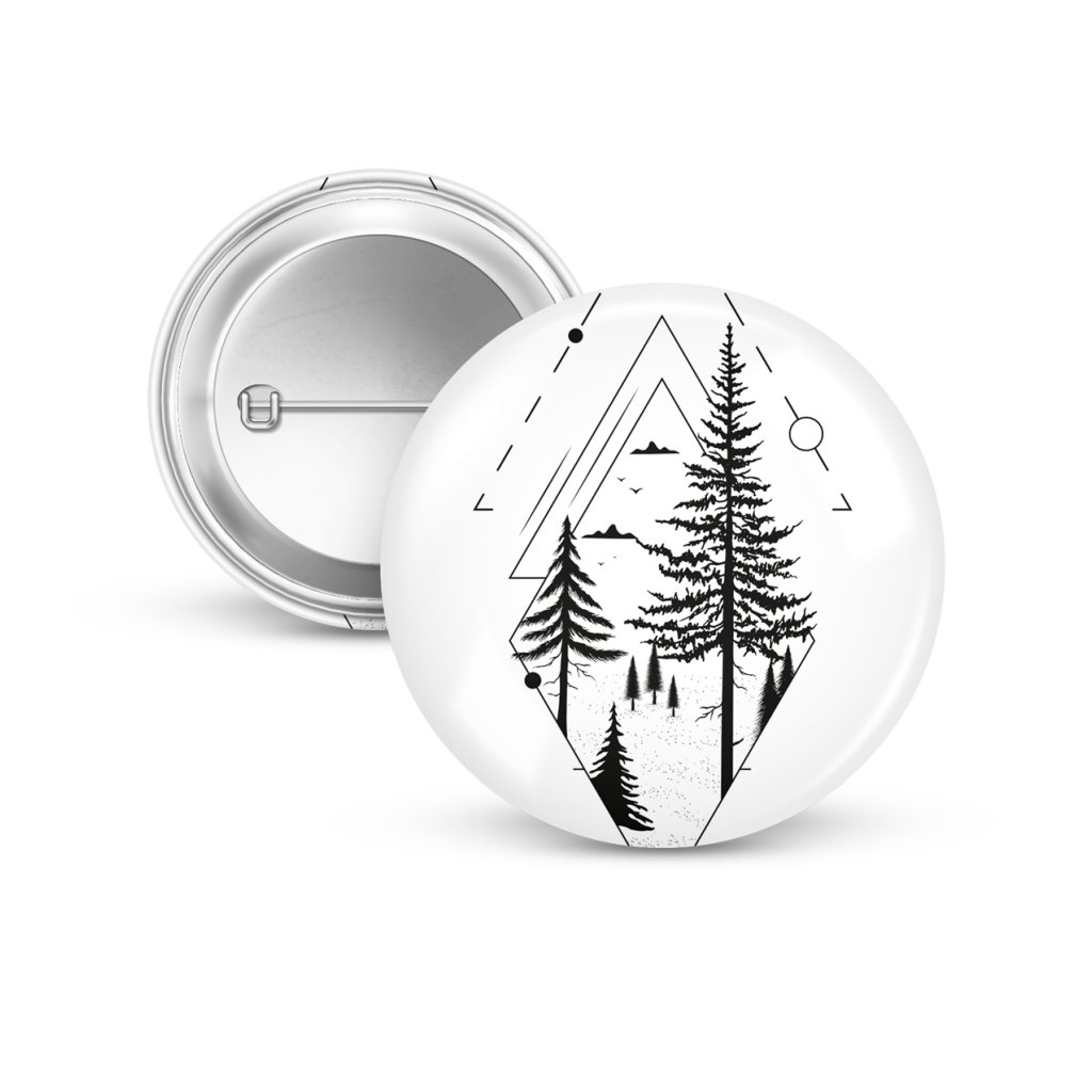 Připínací placka (button) se špendlíkem, se stylovým motivem stromů v geometickém pozadí.