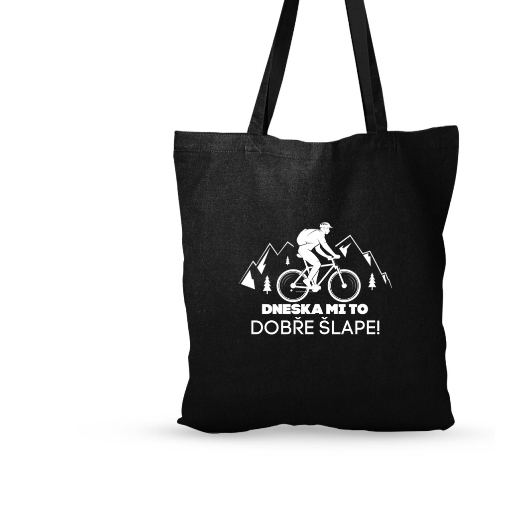 Stylová plátěná taška, s nápisem "Dneska mi to dobře šlape", s potiskem hor a cyklisty.