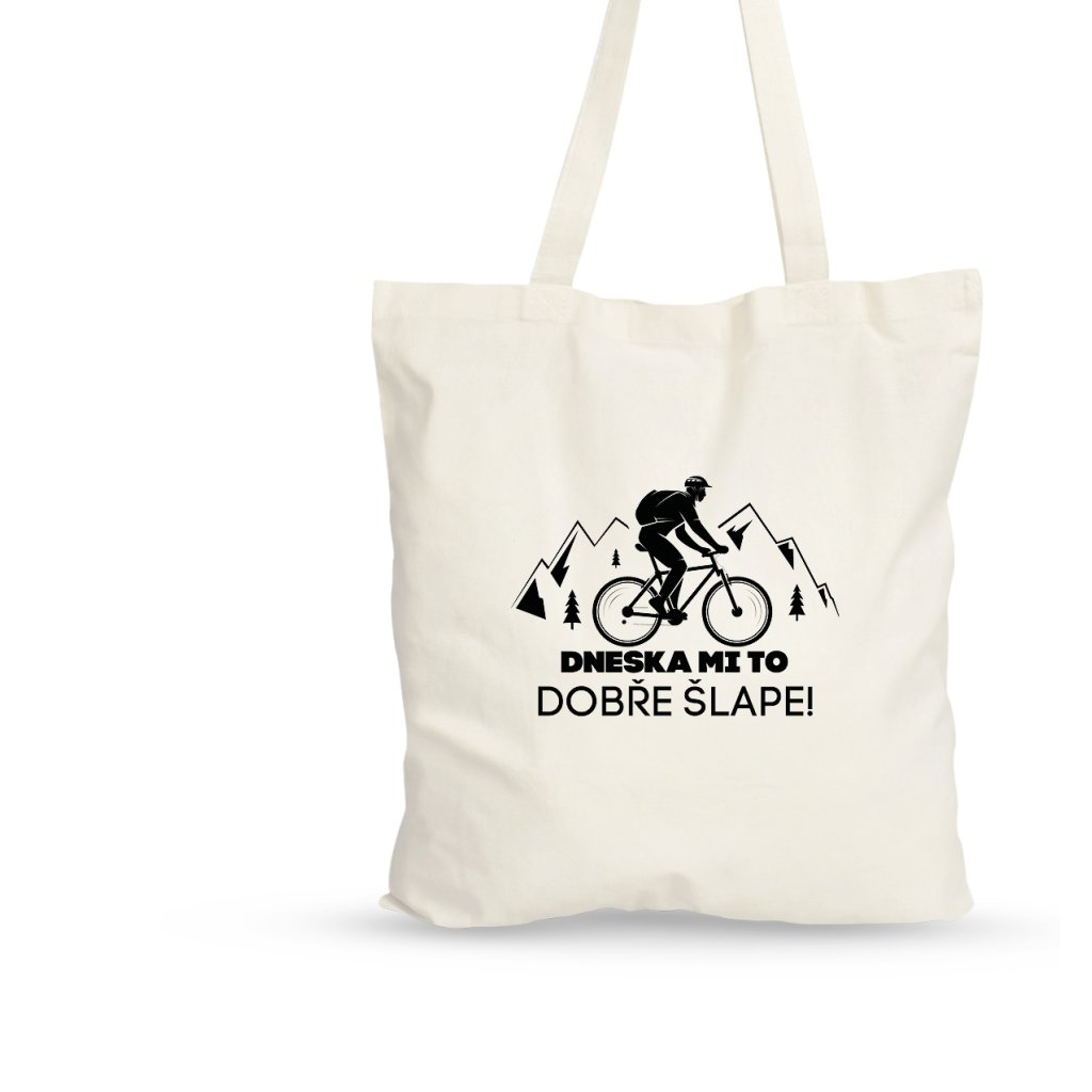 Stylová plátěná taška, s nápisem "Dneska mi to dobře šlape", s potiskem hor a cyklisty.