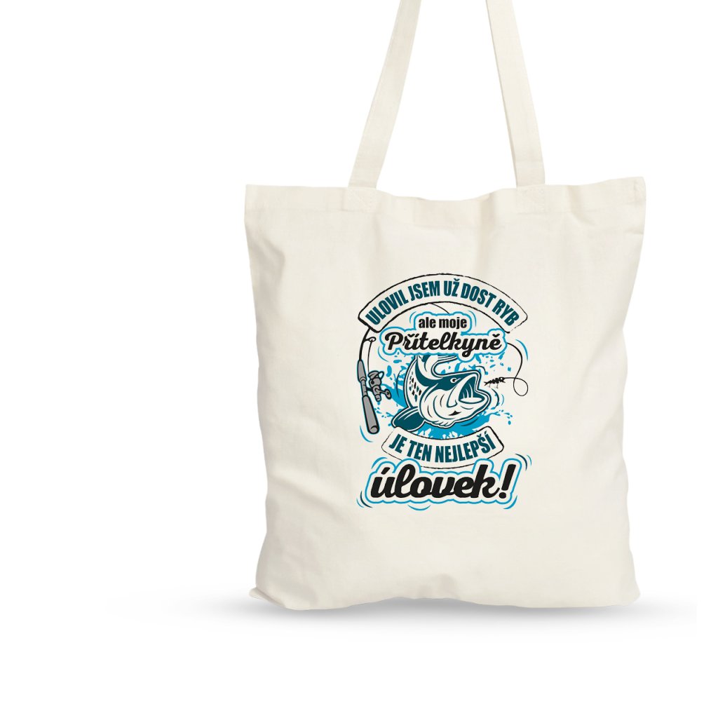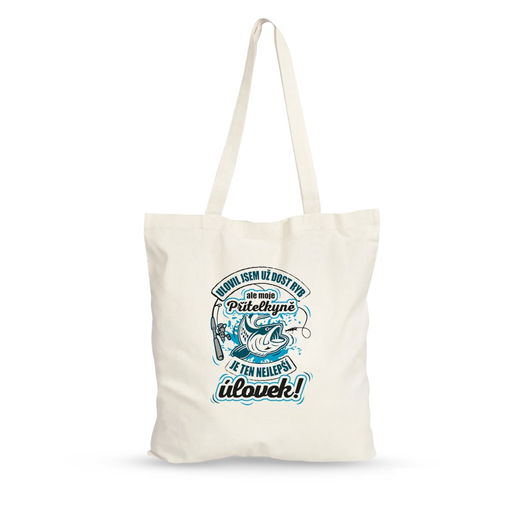 Stylová plátěná taška, s luxusním rybářským motivem a vtipným textem "Ulovil jsem už dost ryb, ale moje přítelkyně je ten nejlepší úlovek!", pro všechny zadané rybáře.