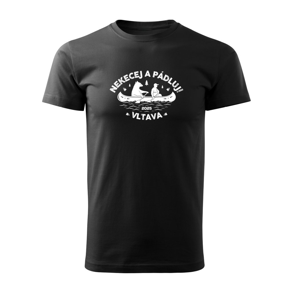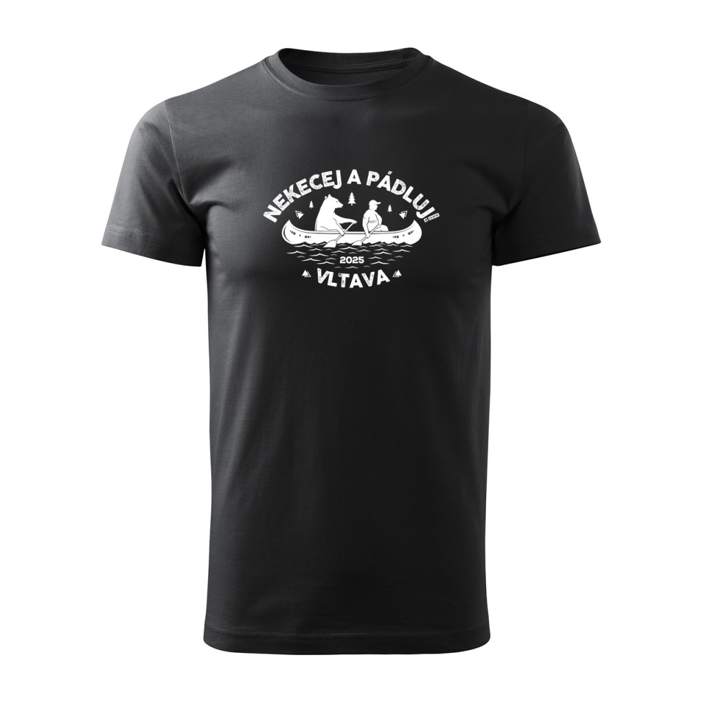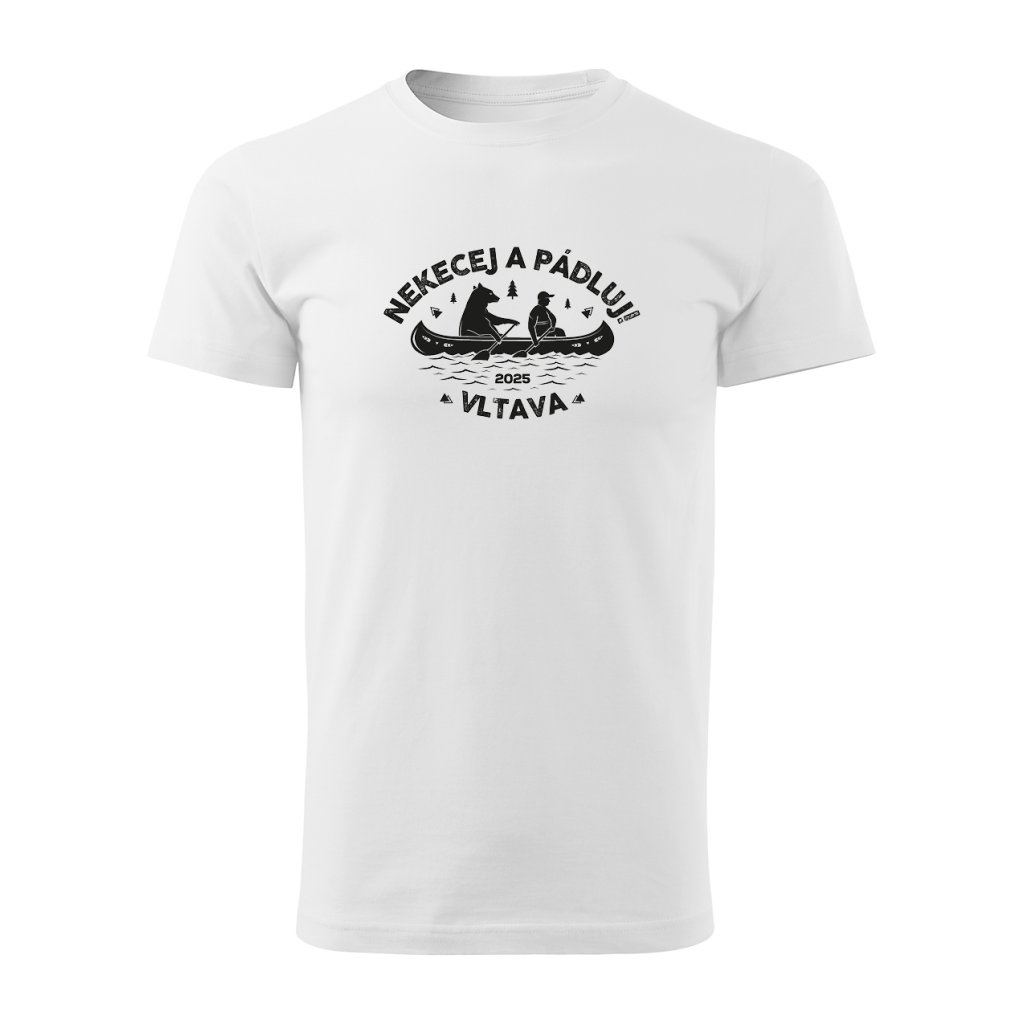 Vtipný motiv medvěda a člověka na lodi se sloganem "Nekecej a pádluj" je jako stvořený pro každého vodáka s nadhledem.