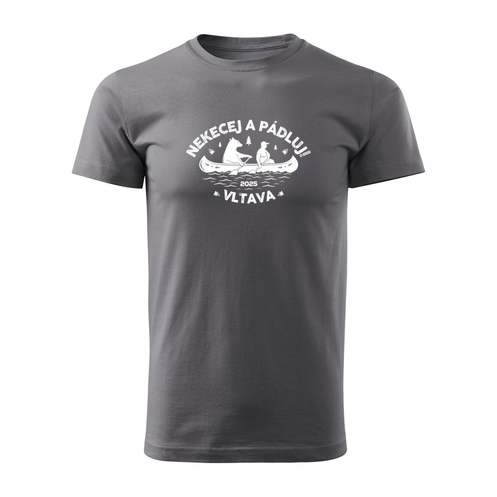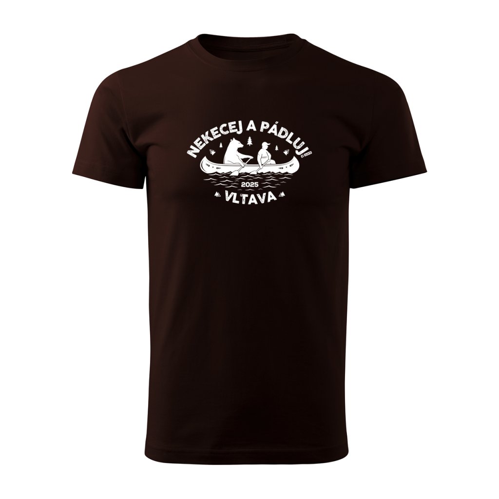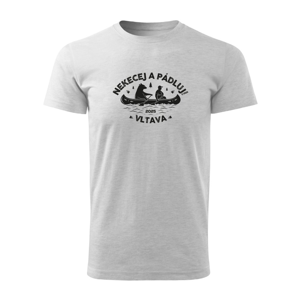 Vtipný motiv medvěda a člověka na lodi se sloganem "Nekecej a pádluj" je jako stvořený pro každého vodáka s nadhledem.