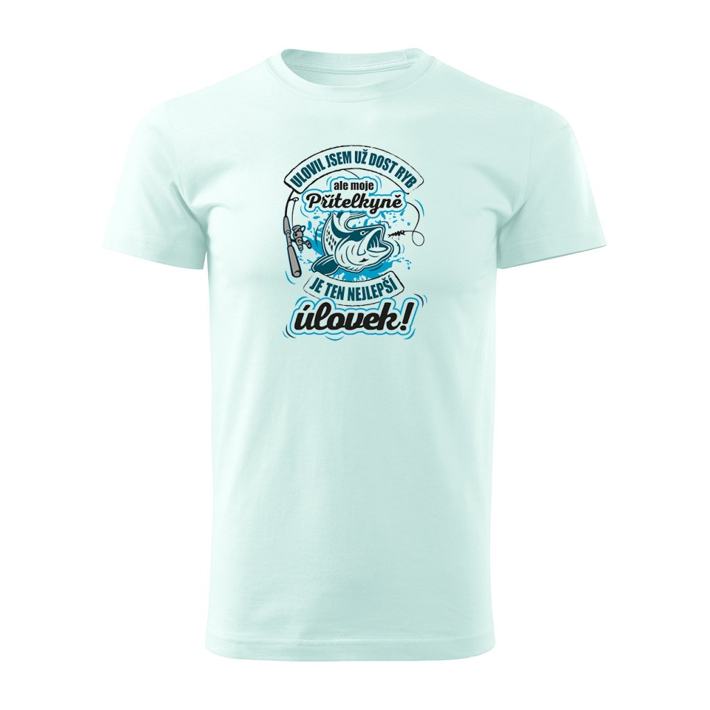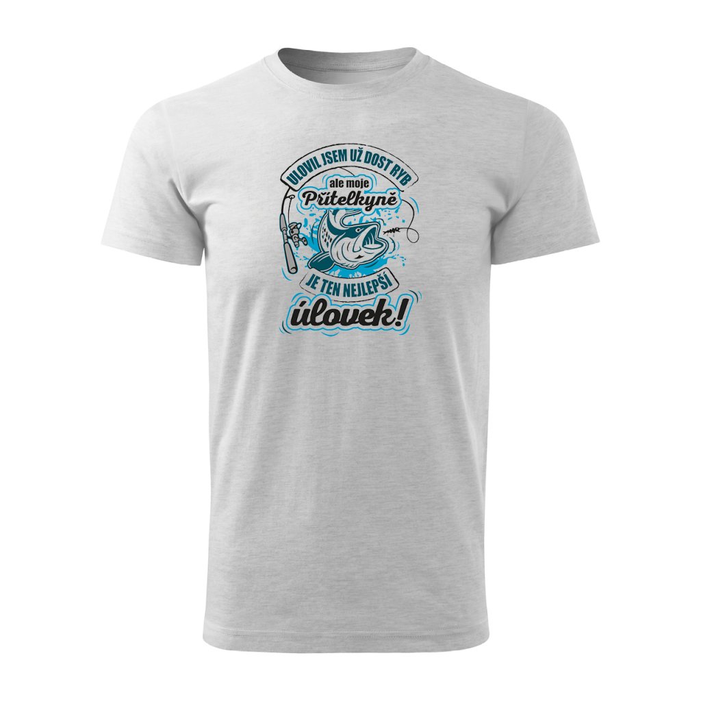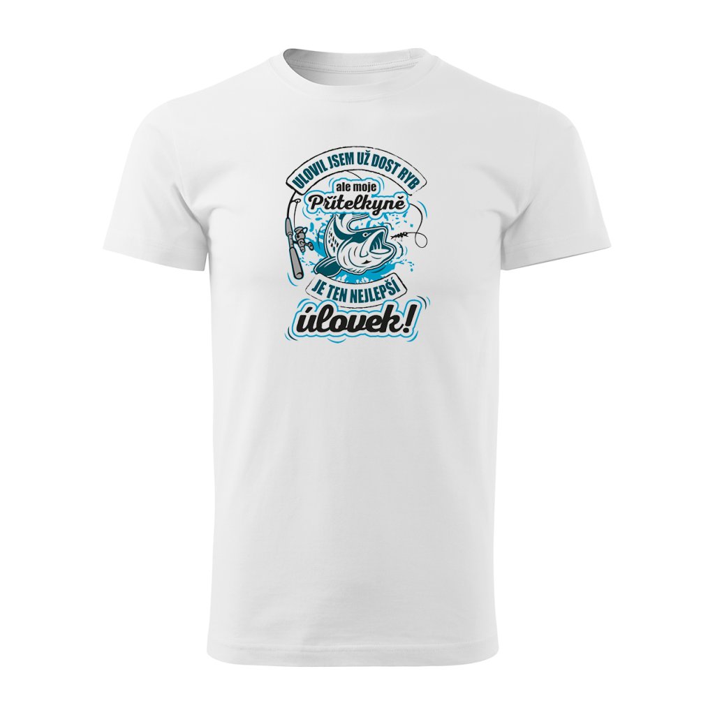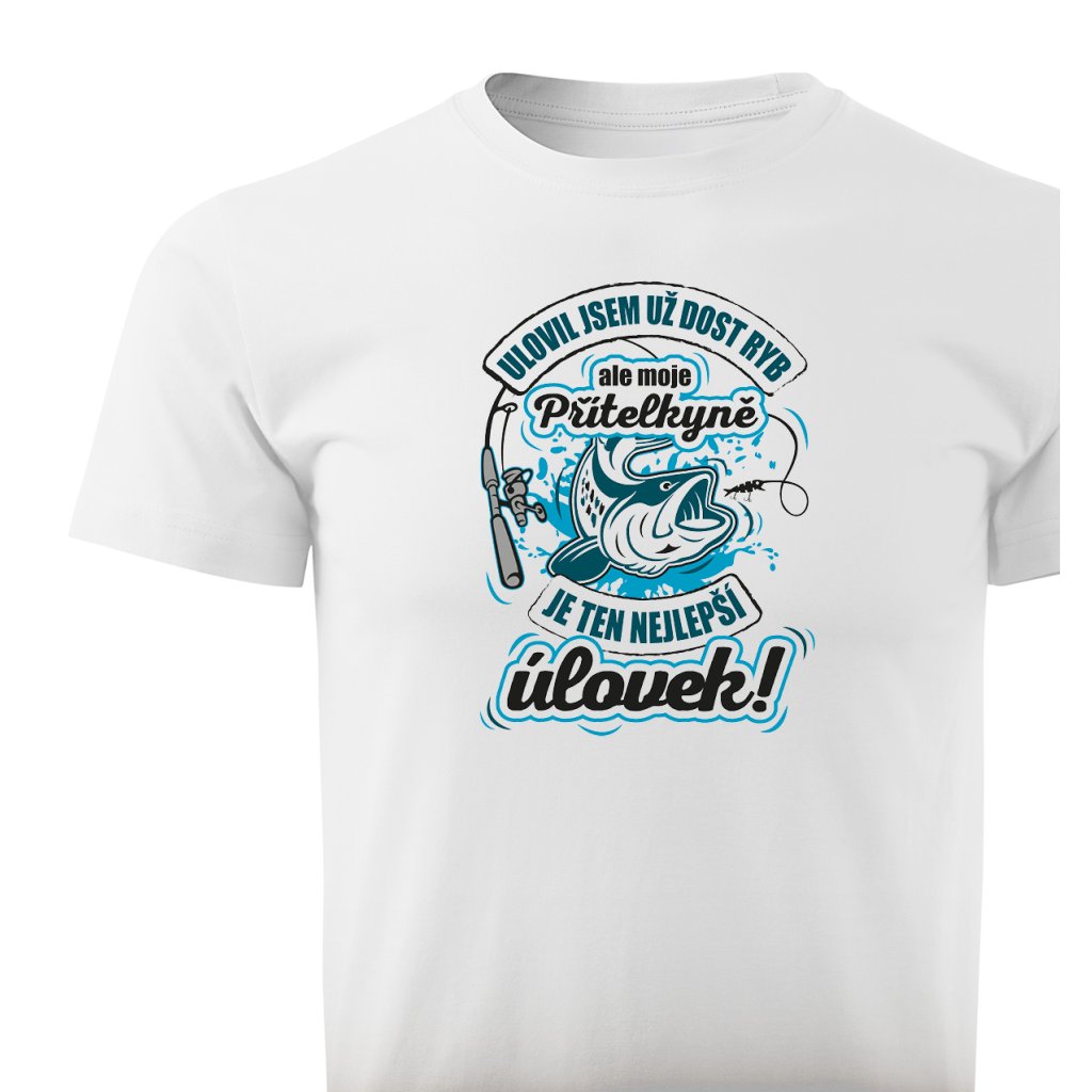 Stylové pánské tričko s luxusním rybářským motivem a vtipným textem "Ulovil jsem už dost ryb, ale moje přítelkyně je ten nejlepší úlovek!", pro všechny zadané rybáře.