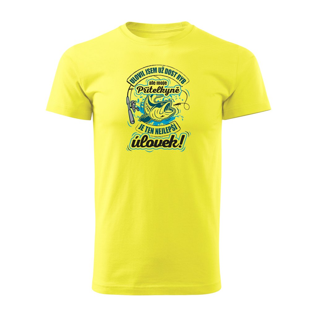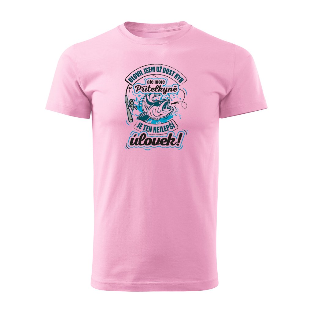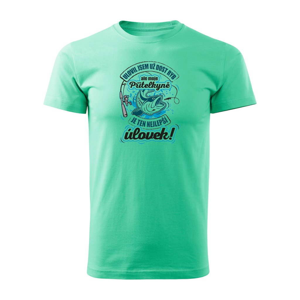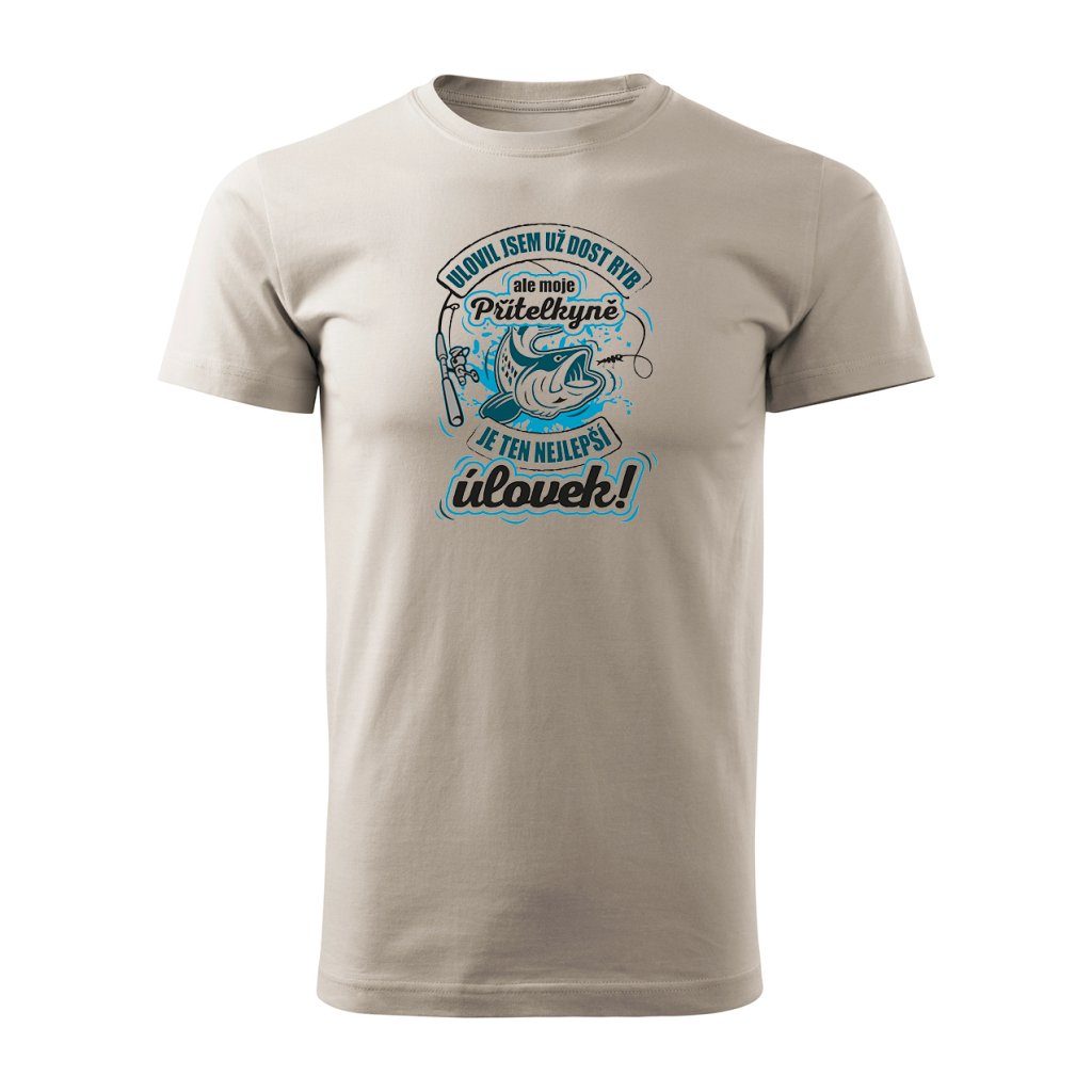 Stylové pánské tričko s luxusním rybářským motivem a vtipným textem "Ulovil jsem už dost ryb, ale moje přítelkyně je ten nejlepší úlovek!", pro všechny zadané rybáře.