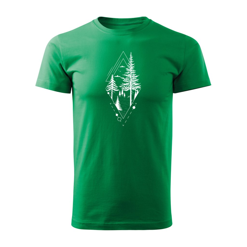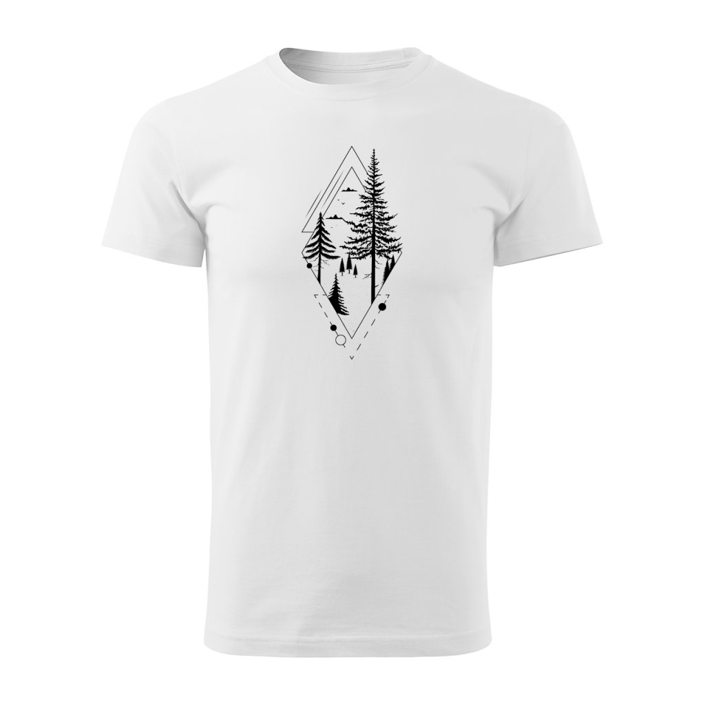 Tričko se stylovým motivem stromů v geometrickém pozadí.