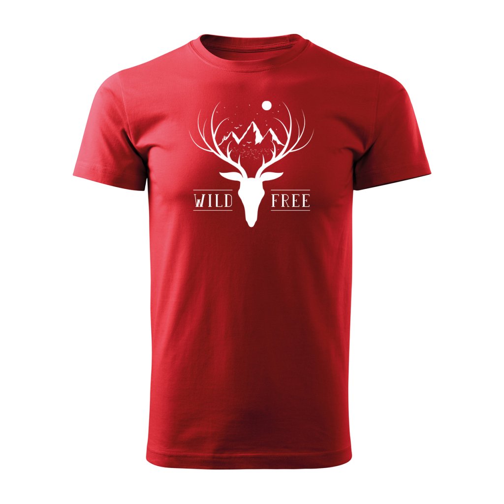 Pánské tričko s motivem jelena a hor, s nápisem "Wild Free".